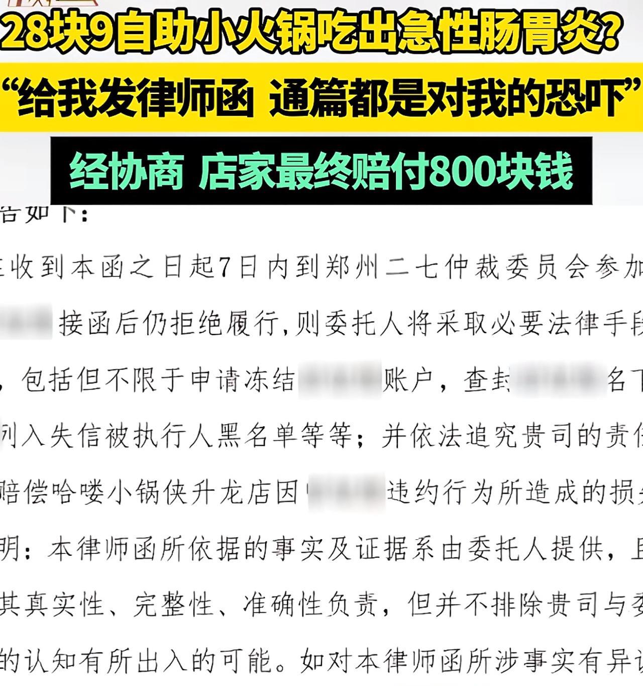 河南郑州,女子花28.9元吃自助火锅,第二天一早,就出现呕吐、拉肚子等症状,赶紧去了医院检查。结果,被确诊为急性肠胃炎,还花了400多元的医药费。事后,女子认为是火锅店食材不新鲜导致,找上门去。火锅店负责人却说,只要医生能证明是吃他们店火锅导致的,他们就承担全部责任,哪怕赔1万都成。女子气愤不已,在商家的美团评论区里吐槽此事。没想到,女子竟收到火锅店的一纸律师函,说要把她加入失信黑名单,还要她赔偿店铺的违损失。 9月13号晚上晚上8点多,曾女士想着找家店吃点热乎的,就去了一家自助火锅店,并团了个28.9的自助券。 到店里选食材的时候,她夹了些木耳、海带、鹌鹑蛋等,锅底选的是微麻微辣,也不算重口。 可当时看见转盘上的香蕉表皮发黑,桃子也带着斑点,就有点犯后悔了。 但考虑已经验过劵了,锅底也上了,想着就凑合吃算了。 结果第二天一早,她刚起床就开始吐,一吐就是三四次,接着又拉肚子,拉得头晕眼花,浑身没力气。 她强撑着身体,去医院挂了急诊,医生一番检查后,确诊为急性肠胃炎。 曾女士第一时间便怀疑,自己的不适是前一天晚上食用的火锅食材不够新鲜所致。 因为,从吃火锅到发病,中间十几个小时,她没再吃任何东西,总不能是平白无故得的病吧? 更让她心疼的是,看病花了400块,比吃火锅贵了10好几倍,还耽误了两天工作。 回到家后,曾女士越想越气,找到火锅店讨要说法,可没想到,对方怀疑她故意讹人,最后,双方闹的不欢而散。 曾女士哪肯善罢甘休,她到商家的美团评论区里吐槽此事,并上传了自己的病例,希望网友给评评理。 没想到,随后,火锅店直接给她发来一封律师函,更离谱的是,这封律师函既没有律所名称,也没有律师信息,通篇都是对小敏的恐吓,说要把她加入失信黑名单,还要她赔偿店铺的违约损失。 曾女士看后,怒火直冲天灵盖,自己的损失对方置之不理,还反咬一口。 她一气之下找来媒体曝光此事。 记者了解到情况后,和曾女士来到了涉事火锅店,接着三方站在了一起,当面对峙此事。 火锅店负责人怀疑曾女士,在火锅店走后,吃了其它刺激性食物了,却把锅甩给了他们。 曾女士坚称自己吃完火锅后的10多个小时直到发病期间,没吃过任何东西。 负责人又当场提出质疑:当天接待了600多个顾客,怎么就她一个人说有问题? 言外之意,怀疑曾女士在故意找茬讹钱。 曾女士急了,拿出手机,翻出美团、抖音该火锅店下面的评论,怒怼:你看不止我一个吧?有人在出急性肠胃炎的,也有吃出蟑螂的,有吃出异物的….. 负责人又说,我们不否认,但是不能把责任都推到我们头上吧,如果曾女士能提供医生出具的,明确指出肠胃炎由食用其店内食品导致的诊断结论,他们愿意承担全额赔偿,哪怕赔偿1千元或1万元都成。 但曾女士认为这一要求实属强人所难。 她说:没有医生能精准判定肠胃炎就是由某一家店的某一顿饭直接引发,医生只能根据患者的发病时间与具体症状,判断食用该店食品与患上肠胃炎之间是否有因果关联。 双方理论了半天,最终,负责人表示,他愿意个人拿出800元对曾女士做出赔偿。 没想到,曾女士说这个事已经不是800元钱能解决的事了,她拿出火锅店发给她的律师函,认为火锅店有恐吓自己的行为,且指出律师函上连个律师的名字和盖章都没有。 最后,在记者的调解下,曾女士同意了800元的赔偿方案。 同时,火锅店向记者出示了他们也拿出了合法经营的各种证件,承诺之后会加强消杀,注意食材新鲜度。 《食品安全法》第148条规定:消费者因不符合食品安全标准的食品受到损害的,可以向经营者要求赔偿损失,也可以向生产者要求赔偿损失。接到消费者赔偿要求的生产经营者,应当实行首负责任制,先行赔付,不得推诿。 曾女士在食用火锅后出现急性肠胃炎,根据医生诊断和发病时间等情况,有理由怀疑是火锅食材不符合食品安全标准所致。 《民法典》第1178条规定:侵害他人造成人身损害的,应当赔偿医疗费、护理费、交通费、营养费、住院伙食补助费等为治疗和康复支出的合理费用,以及因误工减少的收入。 店家以“当天接待了600多个顾客,就你一个人说有问题”等理由拒绝赔偿,这是不合理的,违反了首负责任制的规定,曾女士有权要求店家赔偿其医药费、误工费等损失。