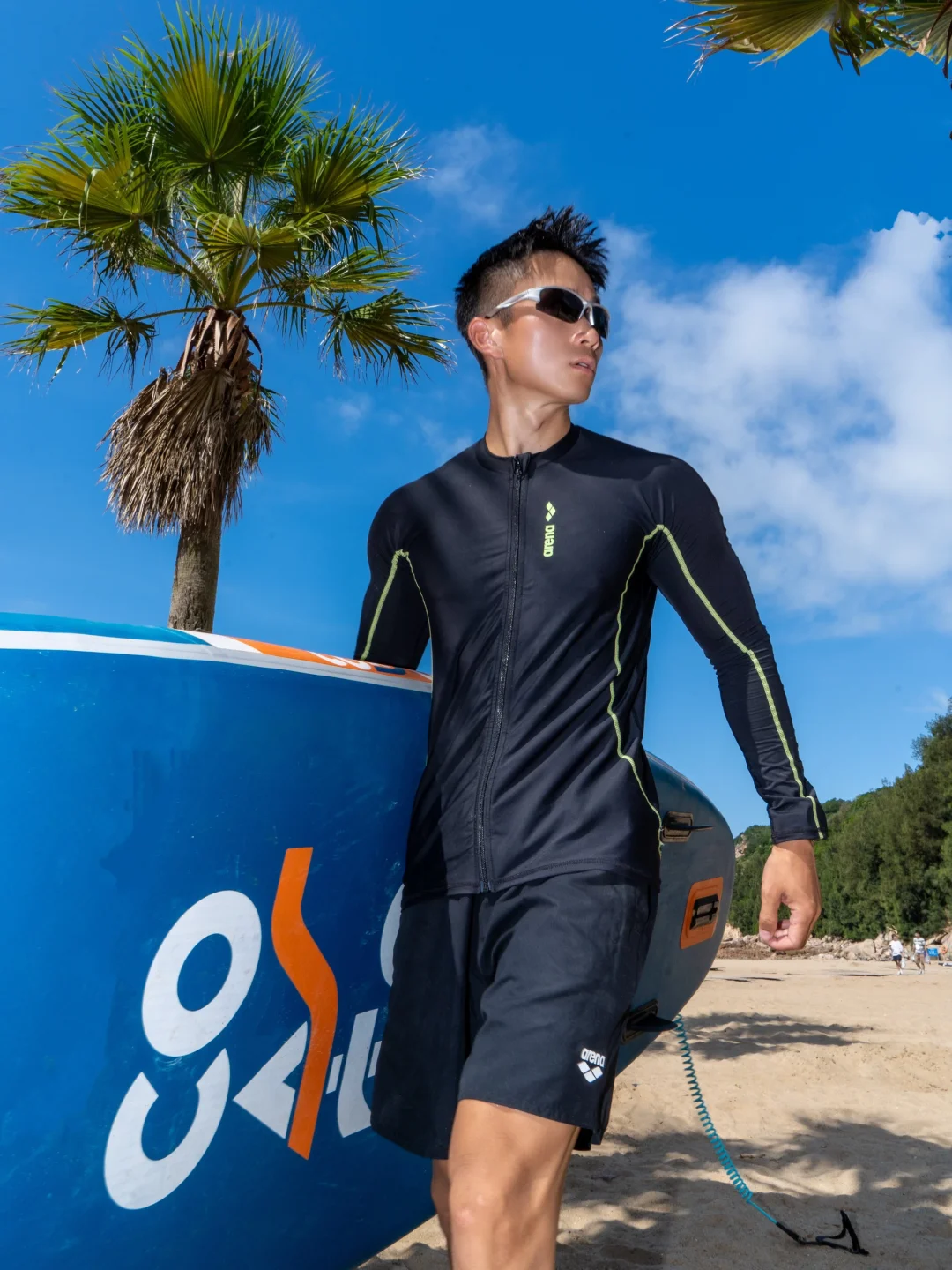 最爱的还是前拉链设计,延续了品牌为运动员打造的人体工学剪裁逻辑,从沙滩走向水里时不用费力套头,湿着手臂也能轻松拉上;划桨时手臂大幅度摆动,袖口也不会往上缩,动作完全不受限。搭配运动短裤是活力感,配一条亚麻长裤又多了点松弛的度假感,这种功能性与时尚感的融合,恰是arena贯穿始终的设计哲学,哪怕划完板直接去海边咖啡馆,也不用特意换衣服,随性又利落。