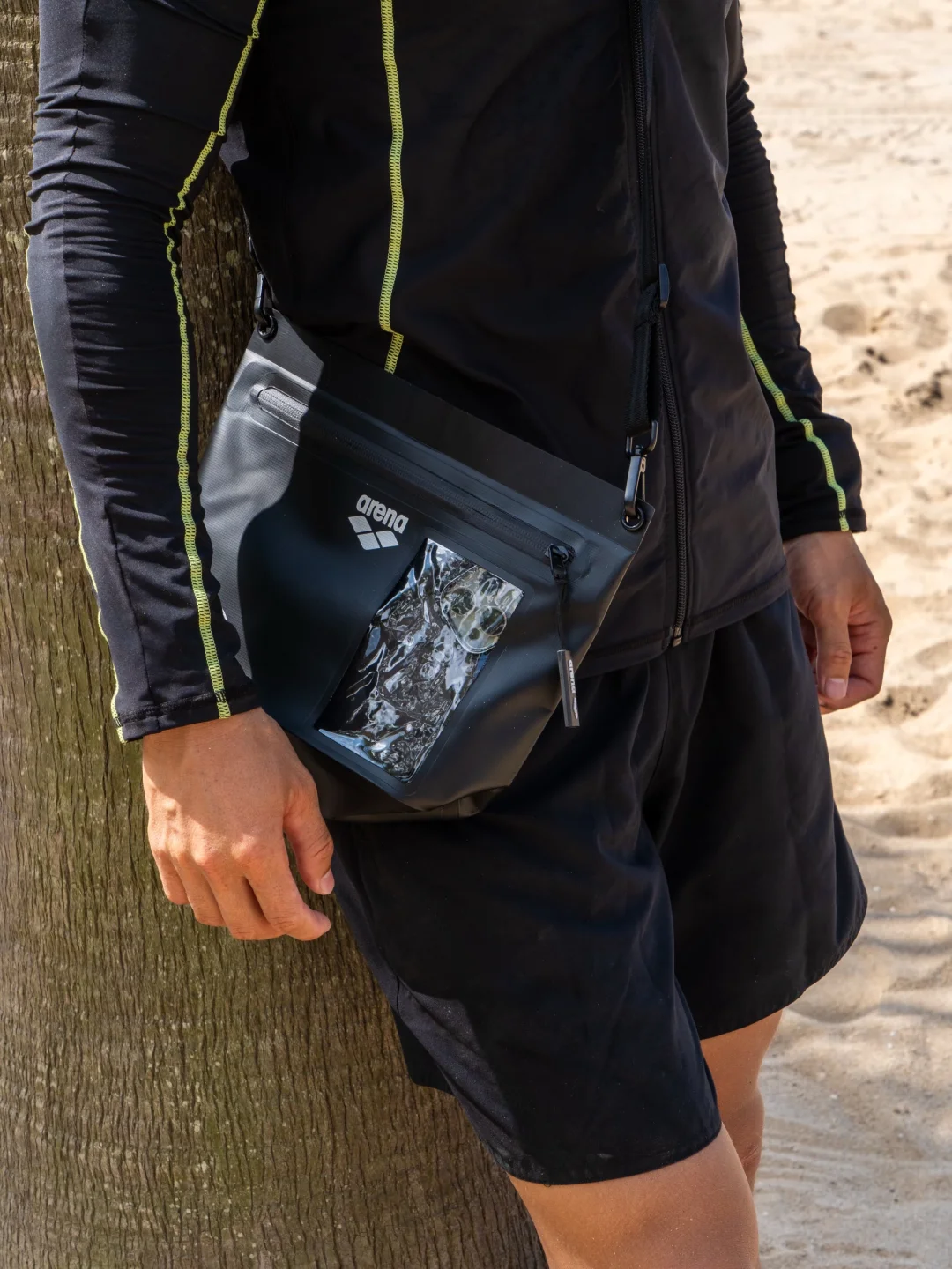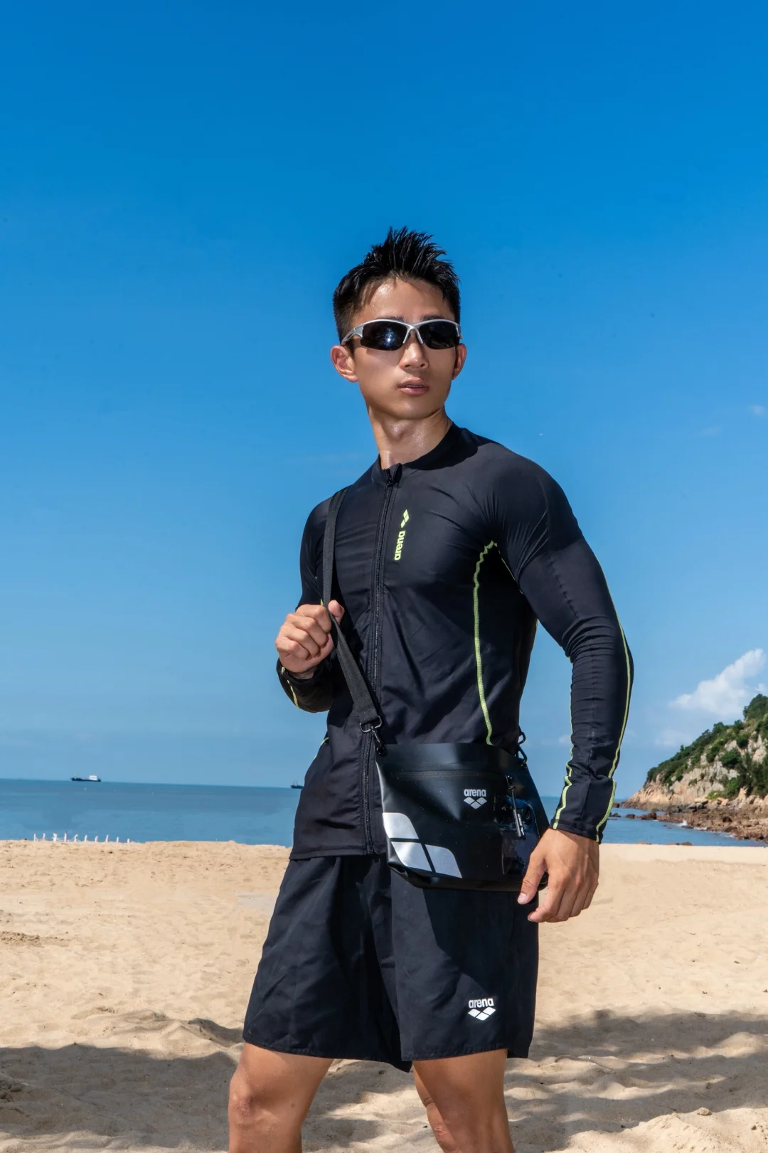 同品牌的防水袋挎包更是刚需搭档。arena在水上装备领域的技术积累,让它的防水性能格外让人安心,手机、防晒霜、毛巾往里一放,拉链拉严就不用担心溅水,斜挎在身上不晃不坠,划桨时不用分心管东西,上岸后拿取也方便,彻底摆脱了“东西没处放”的尴尬。那抹标志性的阿瑞娜蓝,与海天融为一体,像把整片蔚蓝都装在了身边。
