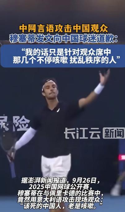 “该死的中国人”你们该醒悟了。意大利网球运动员穆塞蒂为了钱才不得不低头!在25日的中国网球公开赛上(北京),故意用咳嗽来影响他发挥的人。 这些观众掏了真金白银买门票,有的举着牌子,有的扯着嗓子加油,就盼着这位世界排名前20的4号种子能打出精彩比赛。 连其他参赛的选手都说,中国观众既懂礼貌又热情,现场氛围特别好。 没成想,这位被不少人看好的年轻选手,会在比赛不顺的时候,把火撒到看台上的观众身上。 当时比赛打到第二盘的抢七局,穆塞蒂一次发球失误后,脸色沉了下来,嘴里用意大利语嘀咕了一句,还模仿了咳嗽的动作。 现场有懂意大利语的观众没放过这段嘀咕,掏出手机录了下来,没到一天,这段音频就传到了全国球迷的手机里,大家听清了内容——“该死的中国人,老是咳嗽”。 更让人不舒服的是,后来有现场观众说,那几声影响他的咳嗽,根本不是中国观众发出来的,是支持他对手佩里卡德的法国人,而且穆塞蒂当时还往那边看了好几次,不可能不知道是谁在咳嗽。 可他偏偏没说法国人,反而把“中国人”扯了进来,这话一出来,之前为他加油的球迷心里都不是滋味,不少人说“这不是花钱买侮辱吗”,原本对他的喜欢也没了。 穆塞蒂不算无名之辈,4岁就开始打网球,16岁拿了青少年欧青赛亚军,19岁更是把澳网青少年组的冠军拿回家,还成了青少年世界第一。 后来打职业赛,也赢过瓦林卡、锦织圭,甚至在2023年的蒙特卡洛大师赛上,把当时世界第一的德约科维奇都打败了,不少媒体都叫他“费德勒接班人”。 可就是这样一位有天赋的选手,这次却犯了糊涂,而且不止这一次让人觉得不对劲。 之前在法网、美网这些赛事上,观众比中网吵多了,干扰也不少,从没见他抱怨过,怎么到了中国就忍不住了? 这种区别对待,很难不让人觉得他心里对中国观众有偏见。 事件发酵了差不多24小时,穆塞蒂终于在社交账号上发了道歉声明。 可这份道歉没平息多少怒火,反而让更多人觉得他没诚意。 声明里只说自己“情绪失控”,提到了“少数干扰者”,却绝口不提“歧视”这两个字。 大家最在意的就是他那句“该死的中国人”带有的偏见,他偏偏避而不谈。 而且有人发现,道歉之前,他根本没觉得自己错了,甚至觉得自己当时已经够克制了,现在道歉更像是怕舆论闹大,影响自己的比赛和收入,不是真的认识到问题。 更让人反感的是,他发完道歉就把评论区关了,还删了不少批评他的话,这哪像是道歉的态度? 球迷的反应也很直接,有人当场就把穆塞蒂的签名照撕了,还有人说下次他比赛,要去给对手加油。 赞助商那边也没动静,要知道赞助商最看重选手的正面形象,穆塞蒂闹出这种争议,等于给自己贴了“麻烦”的标签,以后会不会有品牌撤资,还真不好说。 之前不管是足球圈的米哈伊洛维奇,还是网球圈的小威、克耶高斯,只要说过不当言论,都付出了代价,穆塞蒂不可能不知道这个道理,可还是没管住自己的嘴。 对打比赛的选手来说,在世界赛场打球,光有好技术不够,得懂尊重别的国家的观众和文化,不能觉得中国市场好欺负就随便说话。 说到底,这就是一句不尊重的话引发的连锁反应,可背后暴露的偏见和不职业,才是最让人生气的。 道歉只是第一步,真要挽回观众的心,还得看他之后怎么做,光靠一篇避重就轻的声明,根本没用。 今天的分享到这里就结束了,大家对此事有何看法,欢迎在评论区留言和讨论,感兴趣的可以点击头像加关注,我将每日更新优质内容,我们下期见。 信源: 原文登载于四川观察2025年09月28日关于《“该死的中国人,老是咳嗽”穆塞蒂吐槽中国观众并模仿,随后道歉》的报道
