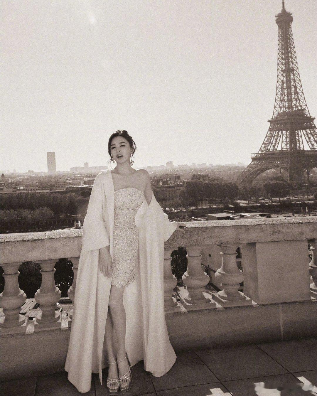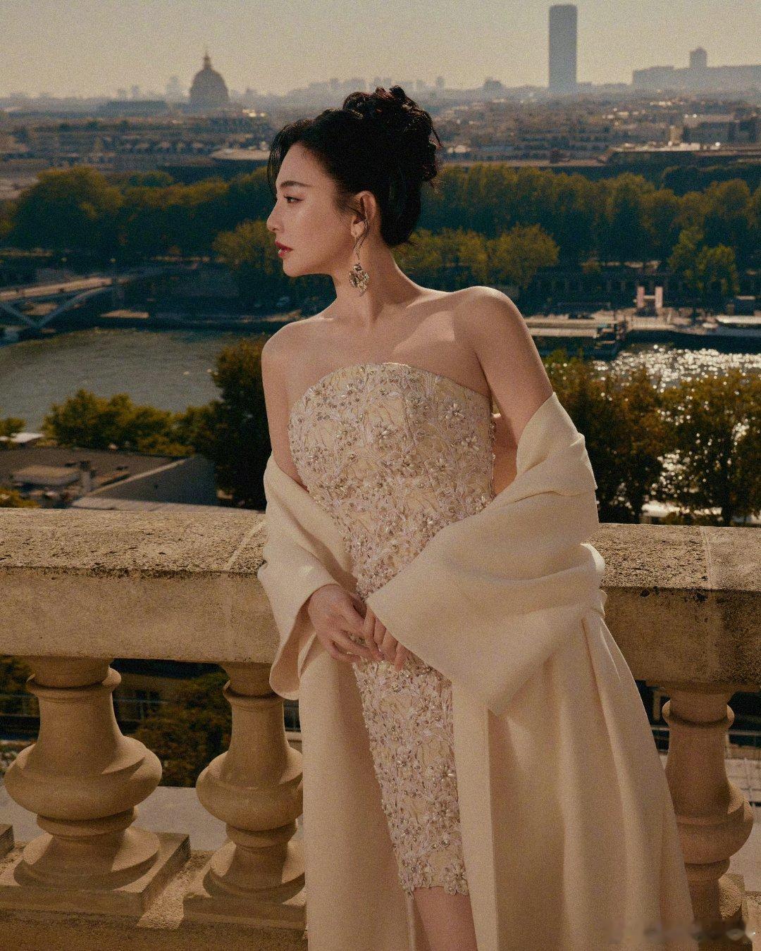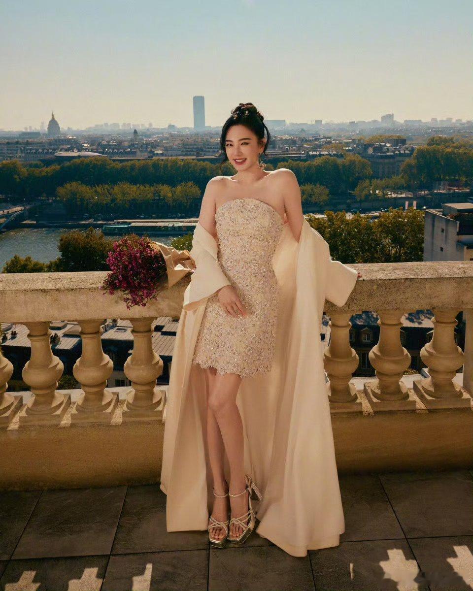 这竟然是张雨绮没认出来张雨绮!巴黎随拍刺绣珍珠抹胸裙配白风衣,盘发露肩颈,楼梯