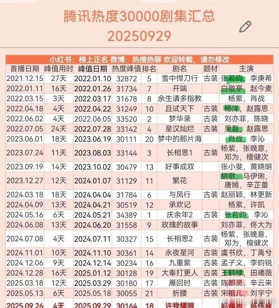 🐧历年破30000的剧,一共21部,男演员一番的有且仅有张若昀,胡歌,白敬亭,杨洋,吴磊,肖战,王鹤棣。