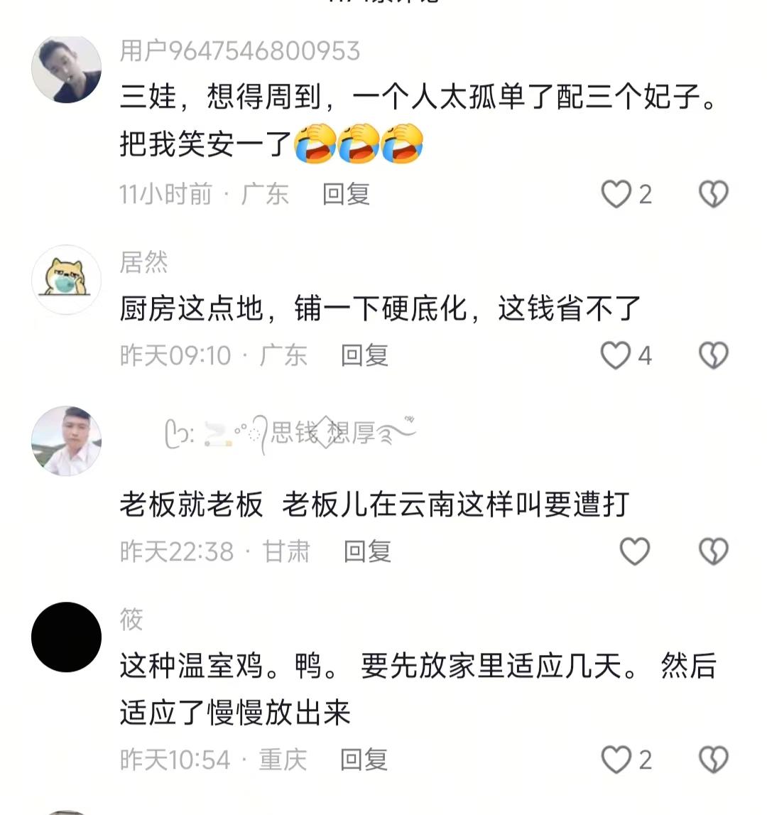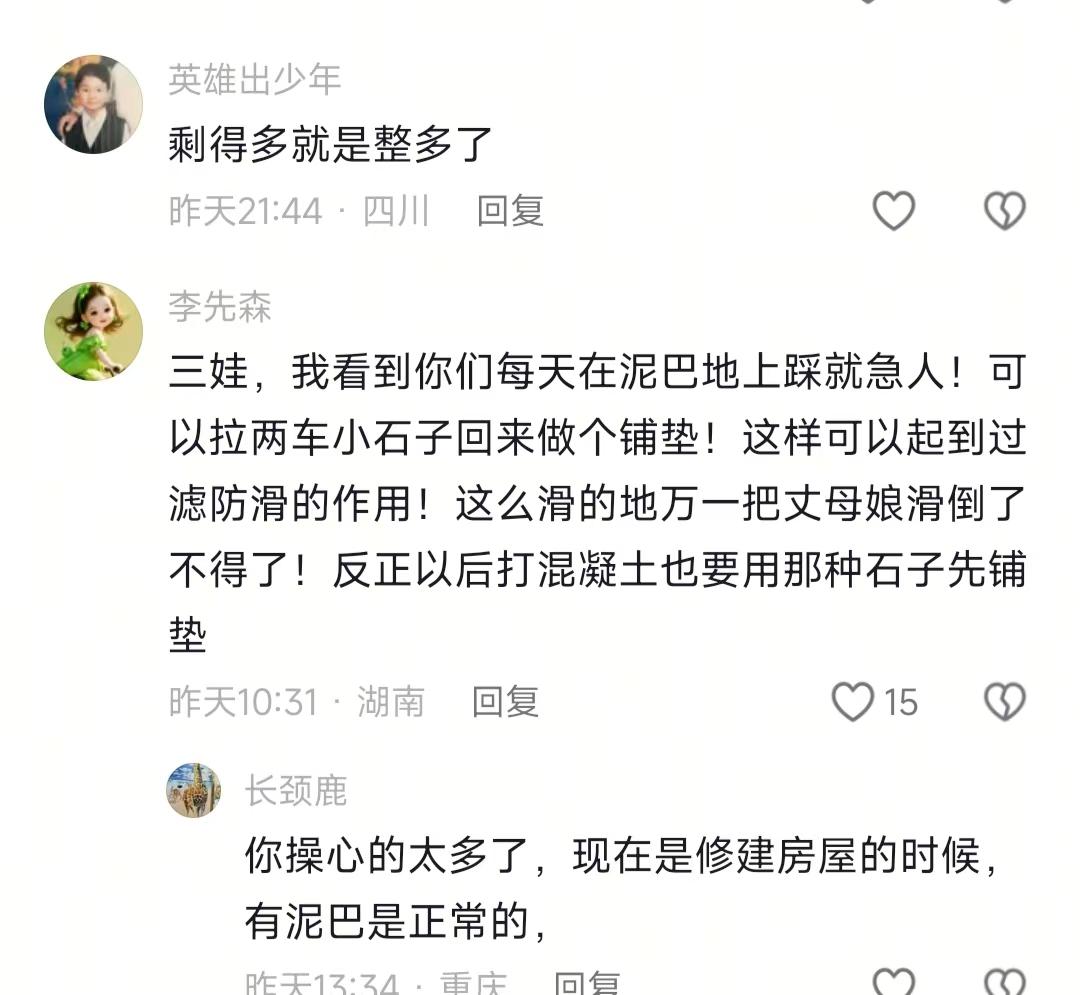 有句话 我一直不敢说 我发现徐三娃建房,有一个非常严重的问题,就是他竟然没有铺路,也就是硬化地面,现在都是水泥的,如果又下雨就不安全不然岳母滑倒就完了 你敢信吗?我刷徐三娃的视频本来是想摸鱼放松下,结果越看越懵——他在工地买了6只鸡、6对鸭给岳母作伴,评论区直接炸开锅!有人夸他孝顺,有人骂他“避重就轻”,连鸡鸭价格、工地泥巴路都能吵上百楼,说实话,我这手本来想划走,结果被这热闹勾得根本停不下来,这不就是咱刷短视频最真实的样子吗? 徐三娃去市场买鸡,商贩说“三王鸡12元一斤”,他连价都没还就说“要6只”;后来买鸭,12元一对,他还说“六六大顺,来6对”。我晕,换我肯定得问“这鸡多大了?鸭子能活多久?”结果他啥都没问,跟买白菜似的干脆。之前我帮老家表哥买鸡,本来想砍砍价,结果商贩说“农村人不坑农村人”,最后还是多花了20块,现在想想,三娃这爽快劲儿,到底是没经验还是心大啊? 三娃把鸡鸭带回工地,跟岳母说“给你作伴”,岳母笑得嘎嘎开心。这场景我太熟了!去年我给奶奶买了只鹦鹉,本来想让它陪奶奶解闷,结果鹦鹉天天乱叫,奶奶嫌吵,最后送给邻居了,郁闷得我好几天没缓过来。说实话,有时候咱觉得好的东西,别人未必喜欢,三娃这运气算好的,要是岳母不喜欢鸡鸭,那咋整? 网友的建议才叫绝!有人说“小鸭得等20天才能下水,不然会感冒”,有人说“工地路得铺石子,不然岳母滑倒就完了”。我和小伙伴都惊呆了,这些网友比三娃还上心!之前我发过一条帮爷爷修菜园的视频,也有人评论“你这篱笆扎太松,会进兔子”,本来我觉得是胡扯,结果没过几天真有兔子把菜啃了,现在想想,网友的话有时候还真给力! 本来我觉得网友吵来吵去没意思,直到看到一条评论:“三娃要是先铺了路,再买鸡鸭,就没人说了”。这话一下子点醒我——之前我二姨总跟我说“做事得有先后,就像种庄稼,先松土再播种”,当时我还觉得是老掉牙的道理,现在看三娃这事,可不就是嘛!你说要是三娃先把泥巴路弄好,网友还会揪着这事说吗? 其实看三娃这事,我想说的是,不管是给家人买东西,还是自己做事,先抓重点!比如三娃,岳母在工地住,安全肯定比鸡鸭重要,先把路弄利索,再买鸡鸭,这不就完美了,你说是吧!