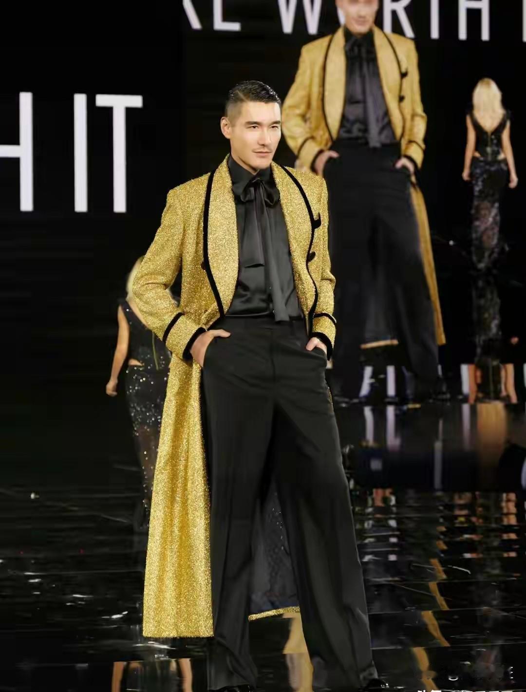 2025年9月29日(巴黎时间),中国初代超模胡兵与瞿颖受邀亮相巴黎时装周欧莱雅大秀,再度携手走秀,成为全场焦点。 - 胡兵:以一袭金色长袍亮相,剪裁利落、线条流畅,台步稳健,尽显东方绅士的深邃气质。 - 瞿颖:身穿金色短裙搭配立体肩部装饰,气场强大,女王范儿十足,与胡兵形成完美呼应。 两人曾在伦敦时装周“HUBING SELECTS: Equal Ethereal”大秀中合体,此次在巴黎的再度同台,不仅唤起了观众对90年代中国黄金时尚时代的回忆,也展现了东方美学在国际舞台上的独特魅力。 此外,胡兵与瞿颖还在走秀中亲自指导新生代演员周也,手把手教学,展现了超模的专业与传承精神。