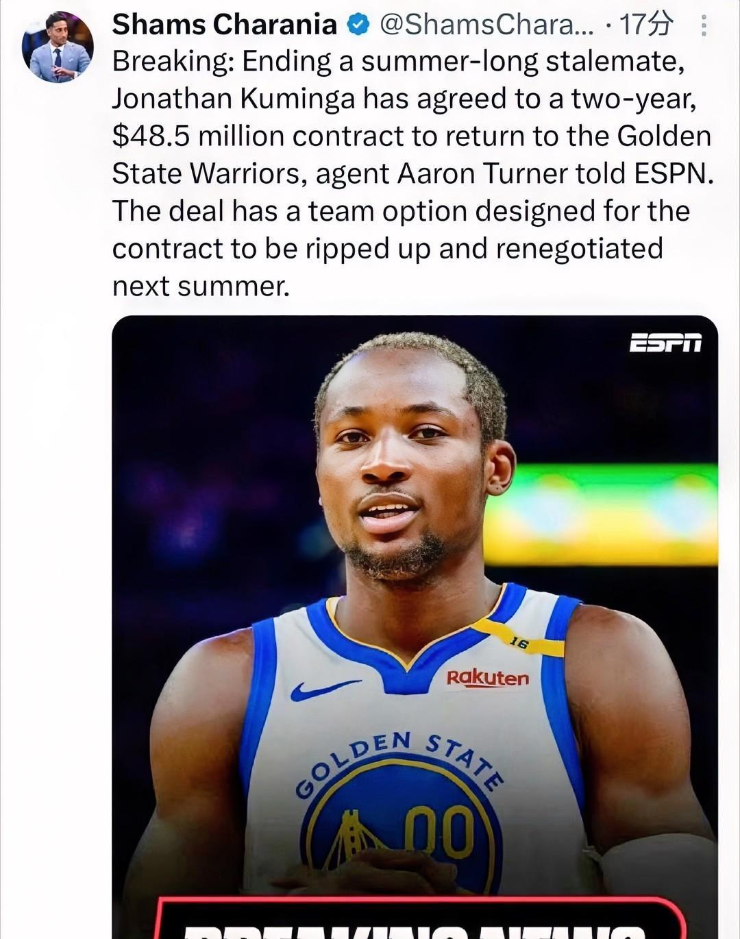库明加2年4850万续约勇士! 据shams报道:库明加和勇士结束了长达一个夏天