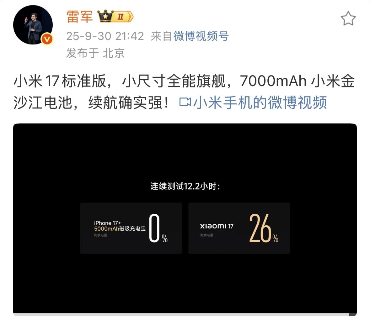 iPhone 17电池容量3698mAh,再加上5000mAh,那就是8698mAh,iOS26 小米17电池容量7000mAh,澎湃OS3 小米官方测试数据,iPhone 17加上充电宝都没电了,但是小米17还剩26%电量!