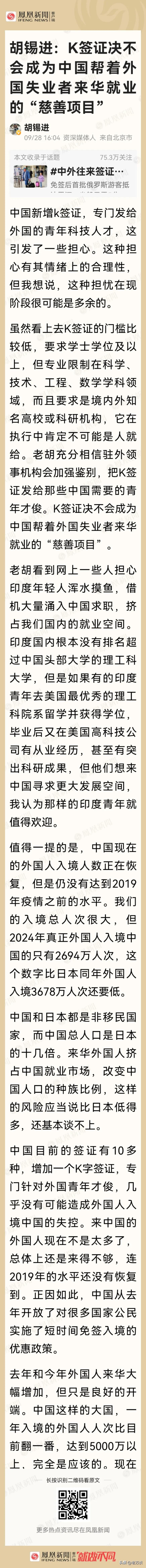 关于K字签证,环球时报前主编胡锡进发表了自己的看法:第一,中国驻外使领事馆一定