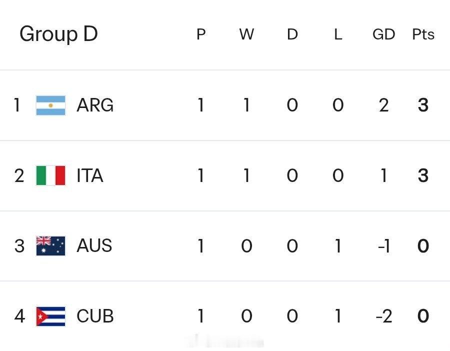 首轮比赛结束后,阿根廷队凭借净胜球优势领跑D组,力压意大利队。🔝