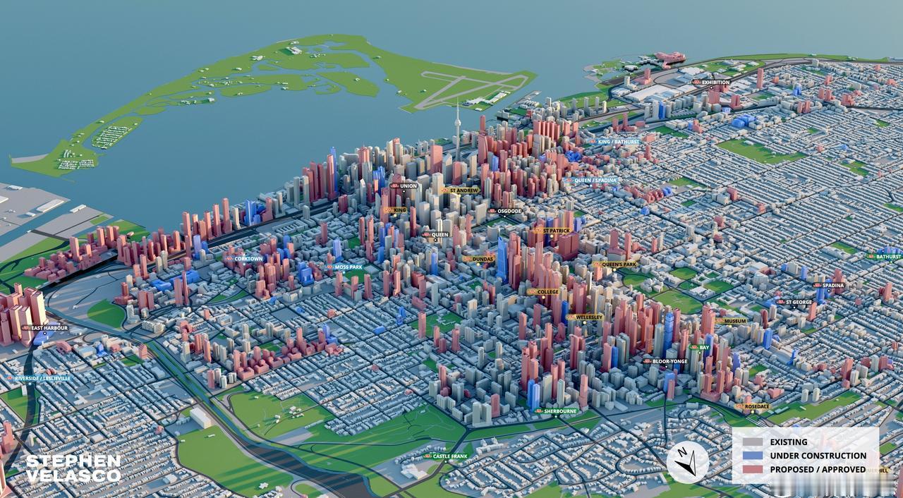 多伦多未来的高楼天际线 虽然前几年的房地产市场热潮放缓阶段,但现在的多伦多仍有数百个项目正在筹备中。城市中心区有清晰的高密化的倾向。信息地图 灰色 = 现有 蓝色 = 正在建设中 红色=提案/已获批