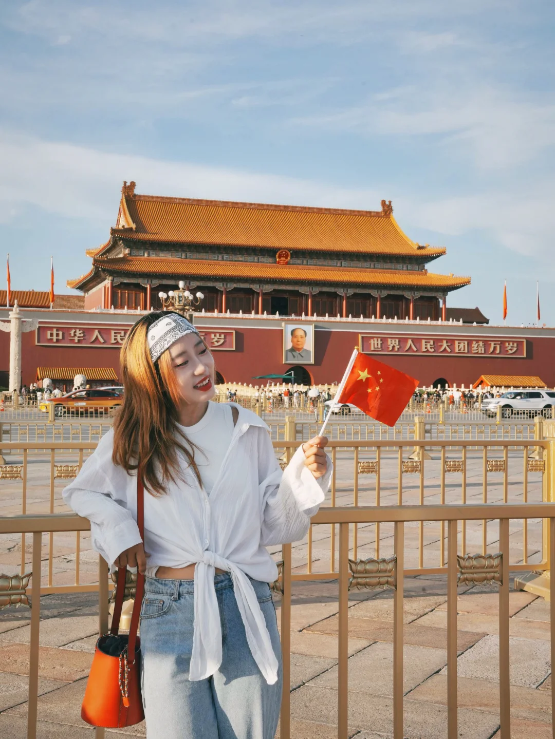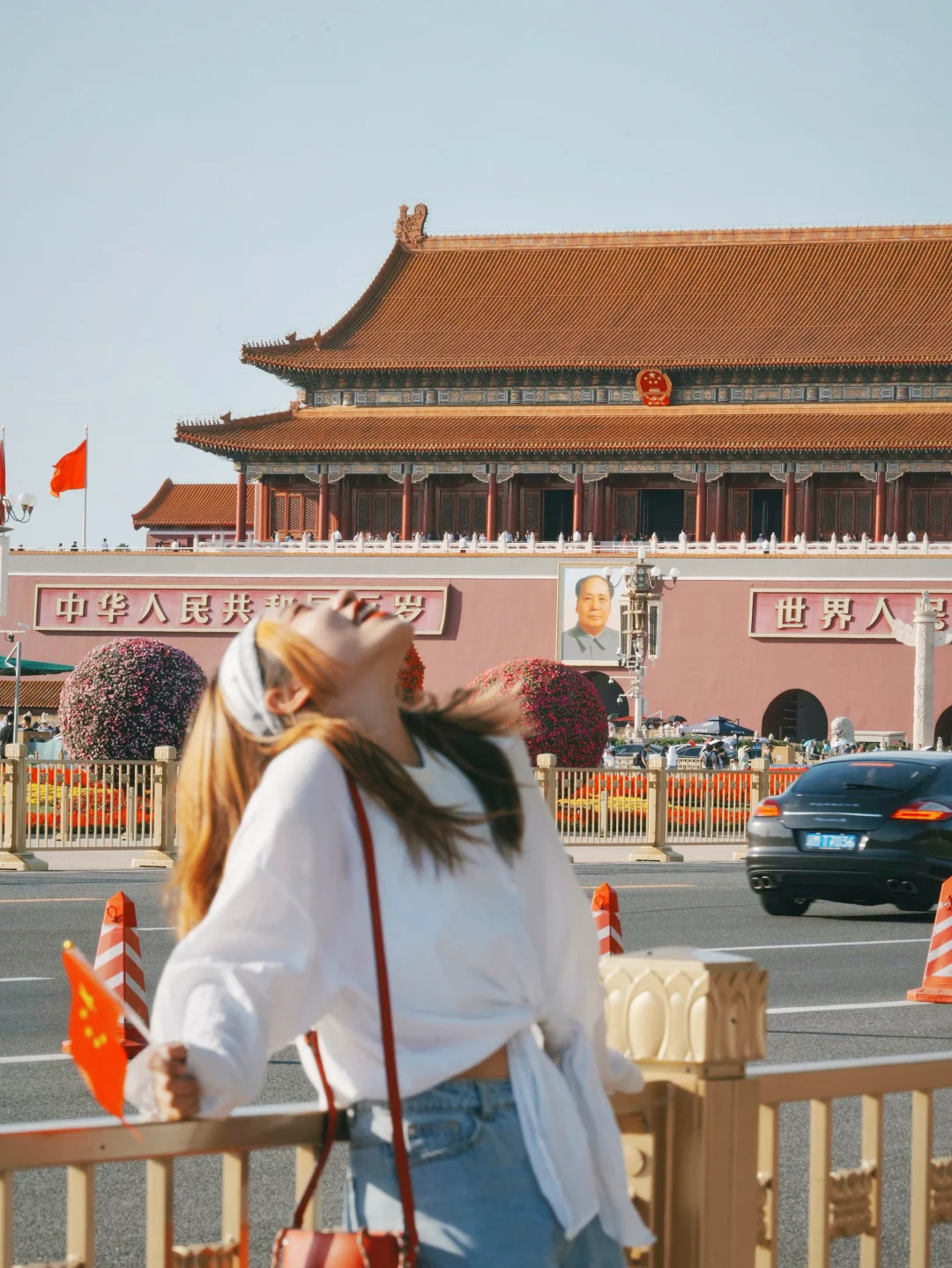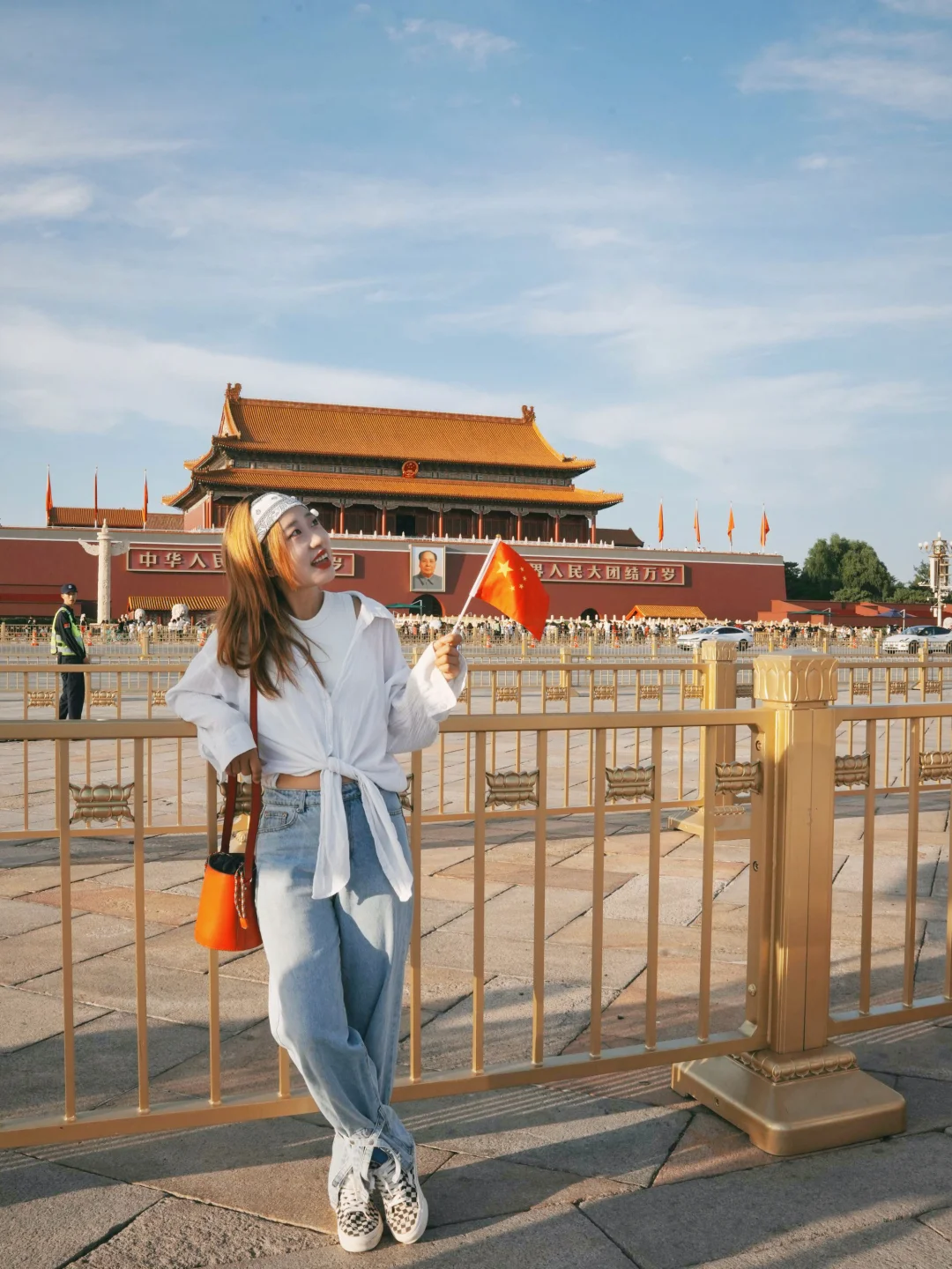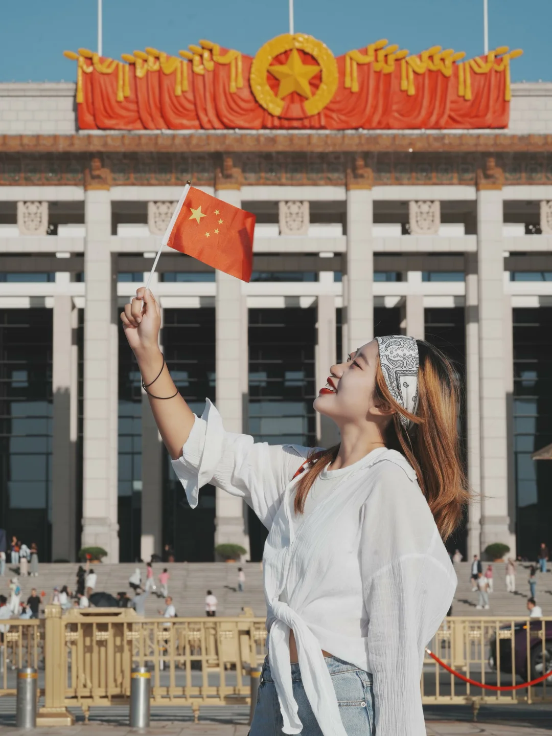 ✅经典C位:广场中间和远处的天安门合影,自豪的举着小国旗,国庆氛围直接拉满