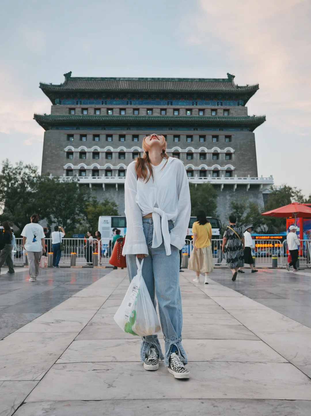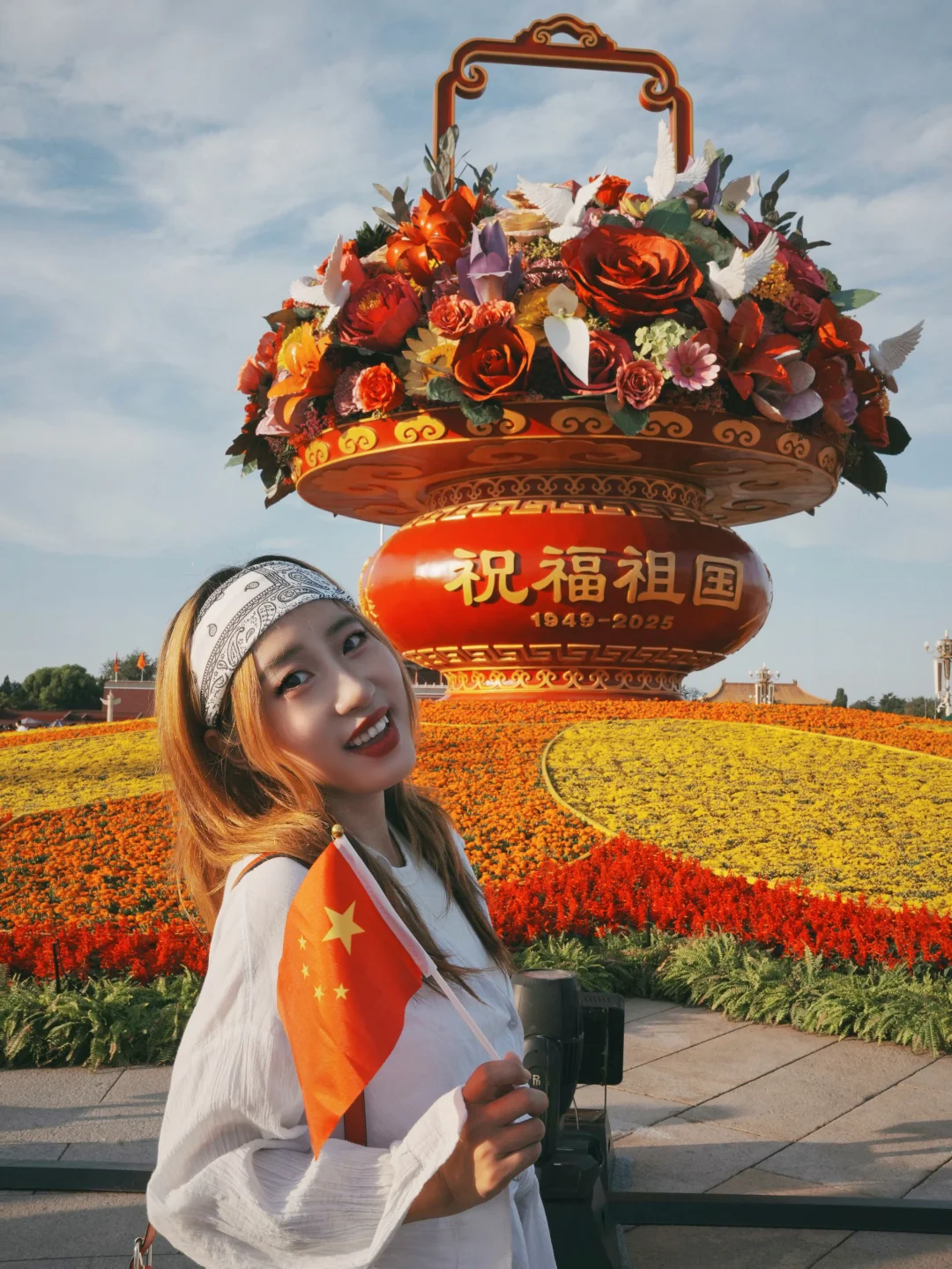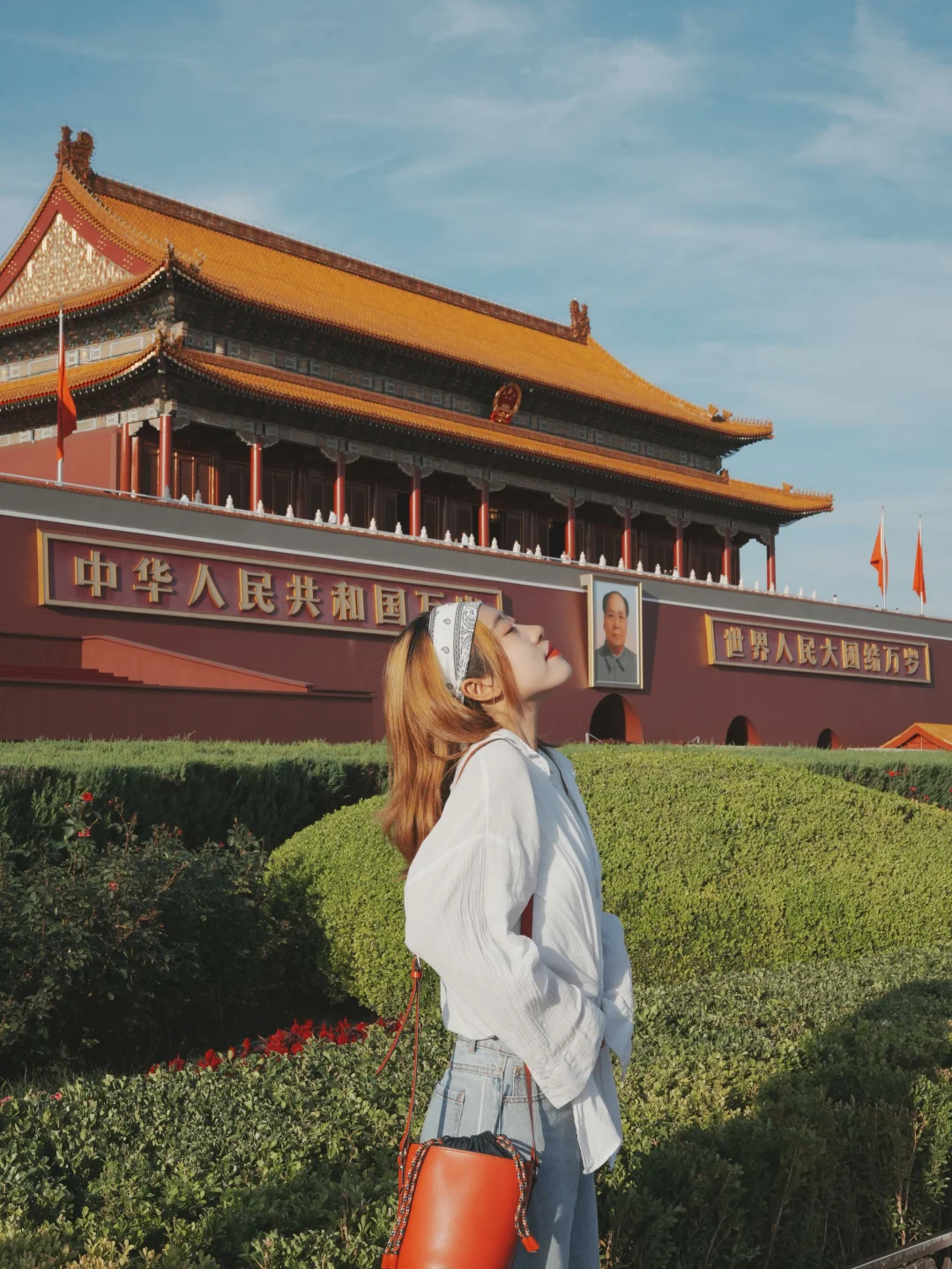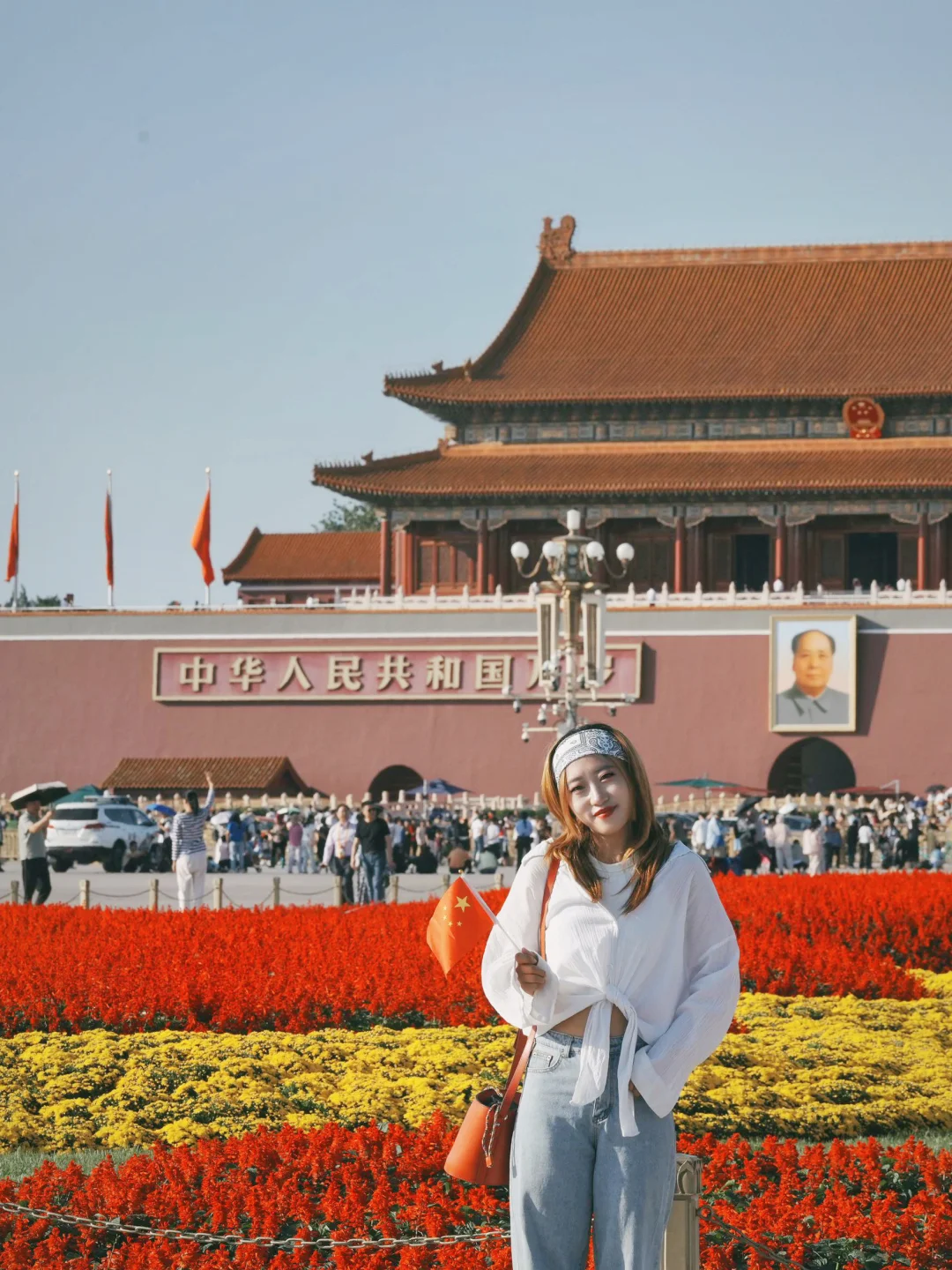 ✅经典C位:广场中间和远处的天安门合影,自豪的举着小国旗,国庆氛围直接拉满