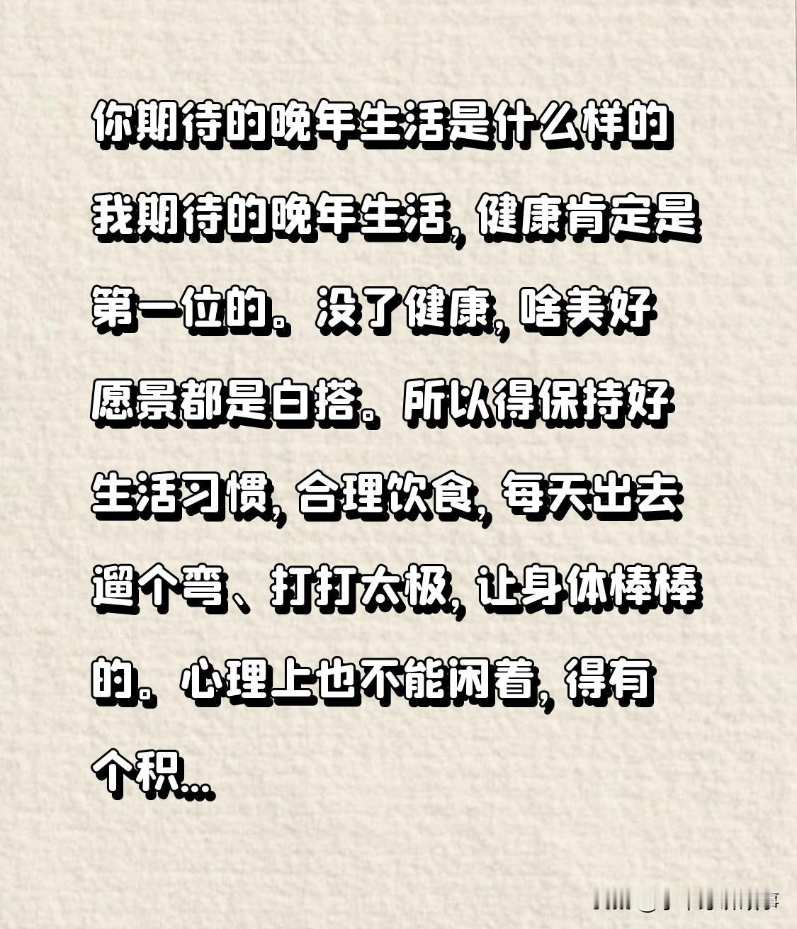 你期待的晚年生活是什么样的你期待的晚年生活是怎样的?我期待的晚年,健康居首。没
