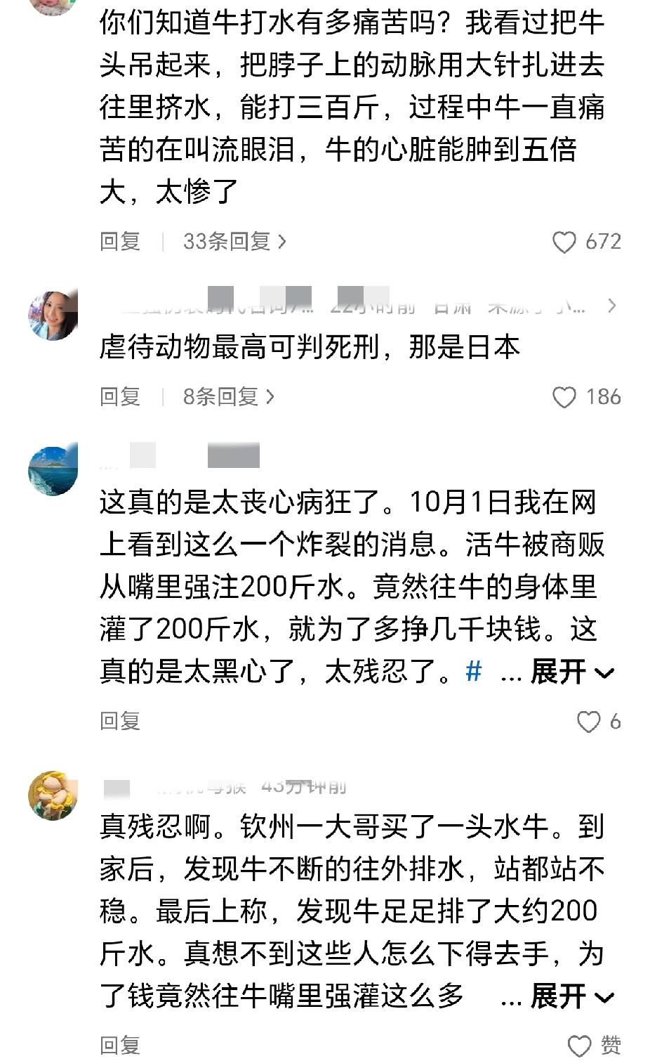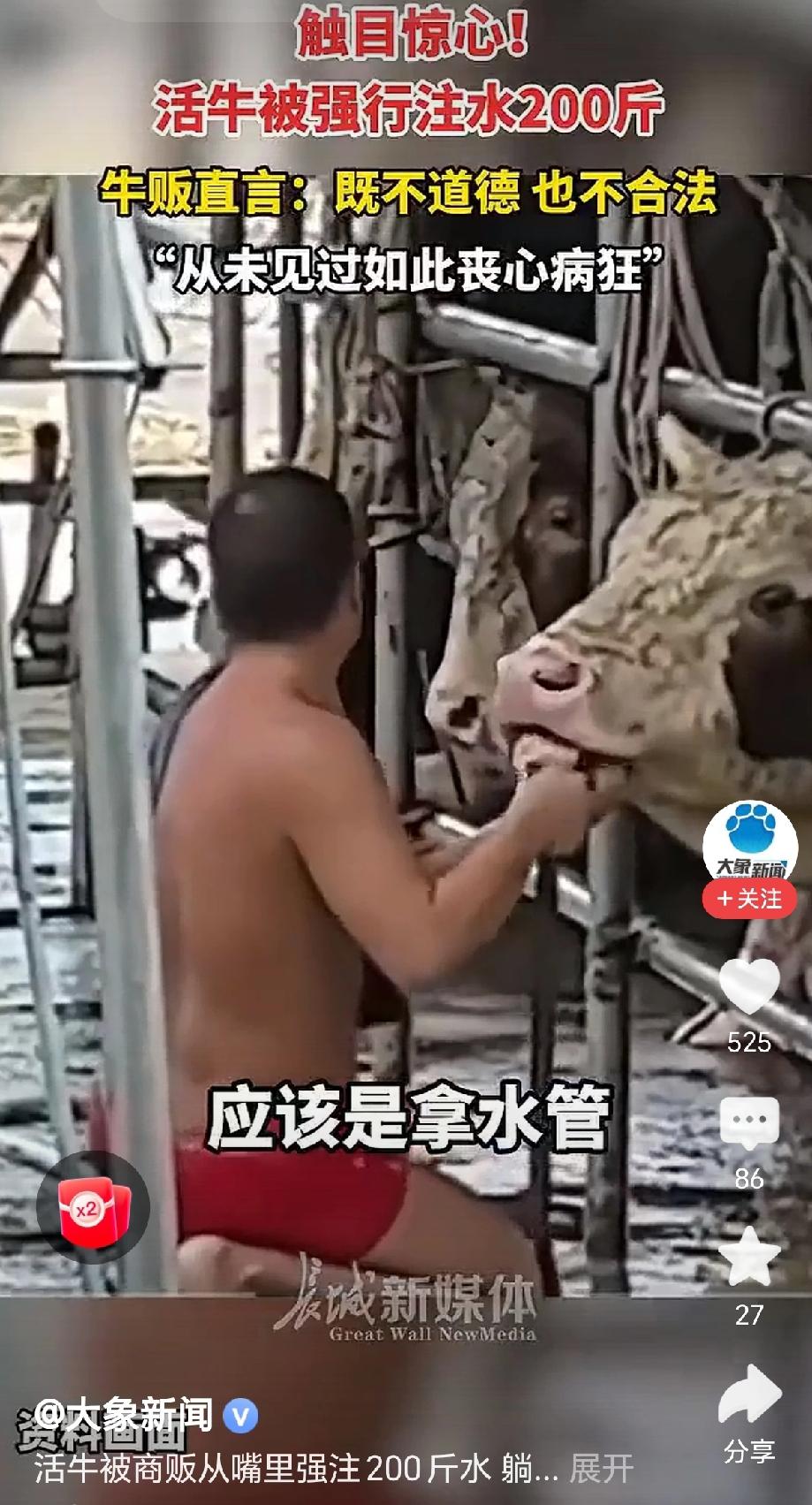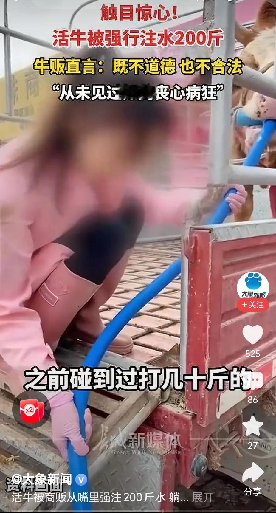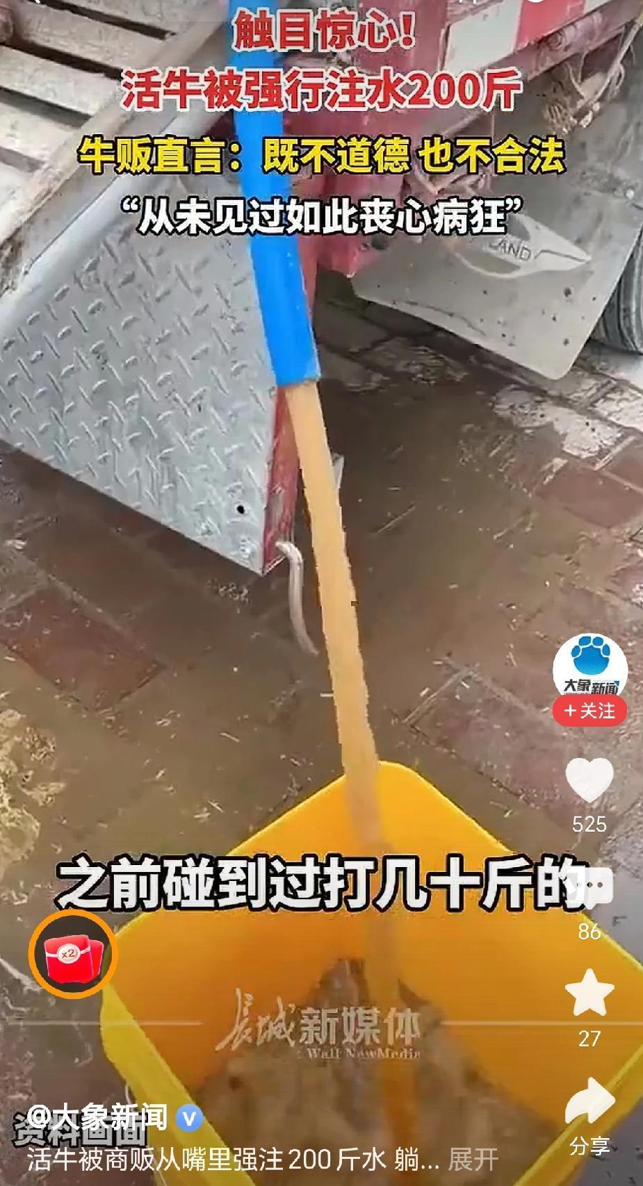 “惊心了,活牛被注水200斤!”近日,广西钦州,一牛贩子爆料称,其收购的一头牛被强行注水,将排出的水上称一称足足有200斤。(来源:@大象新闻) 据大象新闻视频报道,9月30日(接受采访时间)钦州一牛贩向记者爆料,刚买回来一批活牛,发现有些不对劲,怀疑被强行注水了。 “我们于是拉来导水管,准备将水牛身体里的水倒出。”牛贩对记者说,为了指导注水的重量,我们拿来了箱子盛水。 “没想到导出的水整整有两大箱,过秤称了一下重量,超过了200斤。”牛贩说,以前经历过有注水几十斤的,注水200斤的这是第一次。 牛贩直言,“给活牛注水,这既不道德,更不合法!我们将向市场监督部门进行反映,希望能对这种行为进行查处!” “这真是太丧心病狂了!”有网友评论说,给活的牛注水200斤,太残忍了,牛都站不稳了,注水的过程,牛是非常痛苦的! “对这种行为要严肃查处!”有网友说,买回来的牛肉水分太足了,放到锅里小炒根本就做不成,1斤肉就出半锅水,希望能够严肃的处理这种行为! 就是呀,在我看来给活牛注水属于市场欺诈行为,应该从严从快的进行查处。同时,也为食品安全带来了很大的隐患,这些注水的牛肉流入市场,走进市民的餐带来的食品安全风险是多么巨大呀! 对此,你的看法是怎样的呢? 男子称买回一活牛排出200斤水 @秋实99 关注人生冷暖,拥抱幸福生活。