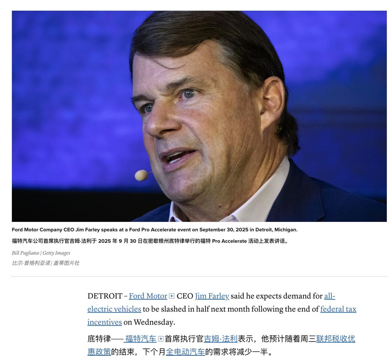 福特CEO:补贴结束后电动车销量会减半 周三也就是今天 美国IRA电动车7500美元的税收抵扣补贴要没了 接下来电动汽车基本和燃油车公平竞争了 福特CEO的意见是 没了补贴,接下来美国电动车的销量要减半 马上就可以见证了 美国那地方,还是更适合混动 HEV、PHEV都可以 跟风特斯拉造纯电车的其实都没赚到啥钱 相反还亏得一塌糊涂,福特的电动车e部门,2024年净亏了51亿美元 而丰田靠着HEV赚得盆满钵满 接下来丰田准备在逐步取消纯燃油车,全换HEV 造电动车,千万别觉得特斯拉可以,中国车企可以,你就可以【来自懂车帝车友圈】