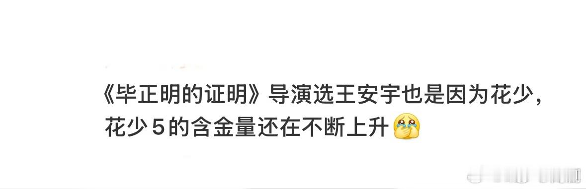 王安宇花少5的含金量还在上升 在《花少5》中,王安宇以真诚阳光的形象赢得了观众的喜爱,这份好感让他被导演看中,参与《毕正明的证明》,大银幕之路顺理成章,未来充满无限可能!