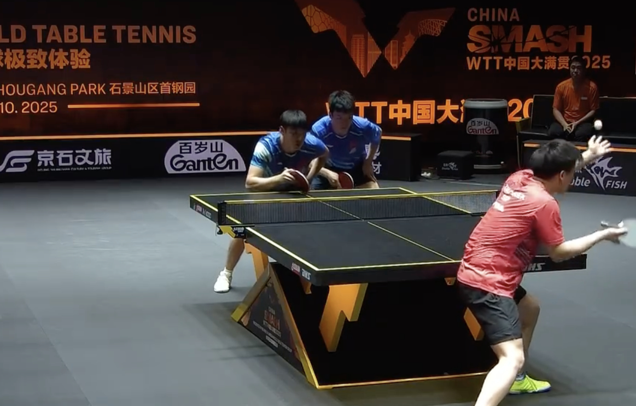 WTT中国大满贯男双1/8决赛,国乒组合薛飞向鹏2-3不敌郭勇冯耀恩,无缘8强,五局比分:11-8、7-11、7-11、11-9、8-11
