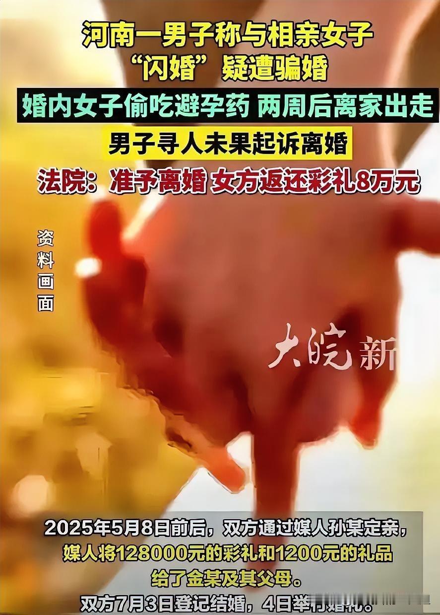 河南沁阳,男子38岁了找不到老婆,媒人给他介绍一女子,认识一周他就着急和女子订婚,给女方12.8万彩礼,1200元礼品,谁料,两人结婚十多天,男子每次和女方同完房,她就偷偷吃避孕药,14天后女子趁男子去上班,偷走他6000元后玩失踪。男子找不到女子,起诉到法院,最终法院这么判。 这场闹剧般的婚姻最终闹上了泌阳县人民法院。赵某和金某从认识到结婚不过两个月,真正共同生活只有短短十四天。法庭上赵某痛诉金某的行为属于有预谋的骗婚,不仅偷偷服用避孕药违背生育约定,还卷走家中现金并拉黑所有联系方式。法官审理后发现,两人确实在2025年7月3日登记结婚,7月18日金某就离家出走,这段婚姻仅维持了两周时间。 法院的判决书点明关键:婚姻自由包含离婚自由,感情彻底破裂就该结束。赵某和金某的婚姻存续时间极短,根本没能培养起夫妻感情,金某通过失联行为表明她完全没有维持婚姻的诚意。虽然两人已经登记结婚,但考虑到共同生活时间太短且彩礼金额较大,法院认为金某应当返还部分彩礼。 庭审时赵某做了个让人意外的决定,他主动提出只要金某返还8万元彩礼就行,比最初支付的12.8万元少了整整4.8万。这个举动被法官理解为赵某对自身权利的自主处分,结合案件具体情况也合情合理。金某全程没有出庭应诉,放弃了为自己辩护的机会。最终法院判决准予离婚,金某需向赵某返还8万元彩礼。 这起事件引发了不少争议。有人替赵某叫屈,觉得金某的行为明显是骗婚,短短十几天就“赚”了4.8万元,简直比上班还挣钱。也有人质疑判决会不会变相鼓励类似行为,让别有用心的人觉得结婚几天就能轻松赚笔钱。赵某的遭遇确实值得同情,除了直接损失的彩礼,婚礼各项开支加上被带走的现金,总损失可能超过10万元。 从法律角度看,这类案件的判决依据主要是最高人民法院2024年实施的涉彩礼纠纷新规。按照规定,已经登记结婚并共同生活的,离婚时原则上不用退彩礼。但共同生活时间很短且彩礼过高的情况,法院可以综合考虑实际生活时间、彩礼使用情况、双方过错等因素,决定是否返还以及返还比例。这个案子中,金某偷偷吃避孕药、拿走现金后失联等行为,都被视为婚姻中的过错表现,影响了法院的判决。 赵某的经历给急于成家的人提了个醒:婚姻不是儿戏,闪婚风险不小。彩礼往来最好保留凭证,婚前多花时间了解对方,避免人财两空的尴尬局面。法院的判决试图在法理和人情间找到平衡,既依照法律规定,又考虑实际案情,希望让婚姻回归感情本质。 各位读者你们怎么看?欢迎在评论区讨论。