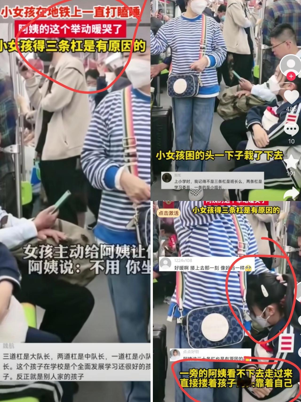 太暖心了! 上海地铁里,一位手臂上带着三条杠,还戴着口罩的女学生,手里抱着书包,坐在座位上,身体不停地在向前倾,仔细一看,眼睛眯着,在打瞌睡了。 看着这一幕真是心疼,现在的孩子学习压力大,晚上做作业好晚,早上又要早起,睡眠时间不充足,在地铁里,这摇摇晃晃地,睡意很快就来了,看着女孩这样晃,一不小心就会瞌到地上了,那多危险。 旁边一位阿姨见到这一情况,毫不犹豫走过来,一手扶着女孩的头,靠在自己怀里,一手拉着车上吊着的扶手环,让女孩稳稳地靠着自己。 生活中,这是素不相识的两个人,却给了孩子母女般的爱,这是刻在骨子里的善良,这小小的举动,是地铁上最美的风景。在平凡的生活中,让我们人人献出一点爱,世界将会变成多么和谐美好。 大家有碰到过这么暖心的画面吗? 晒图笔记大赛 地铁上的一幕