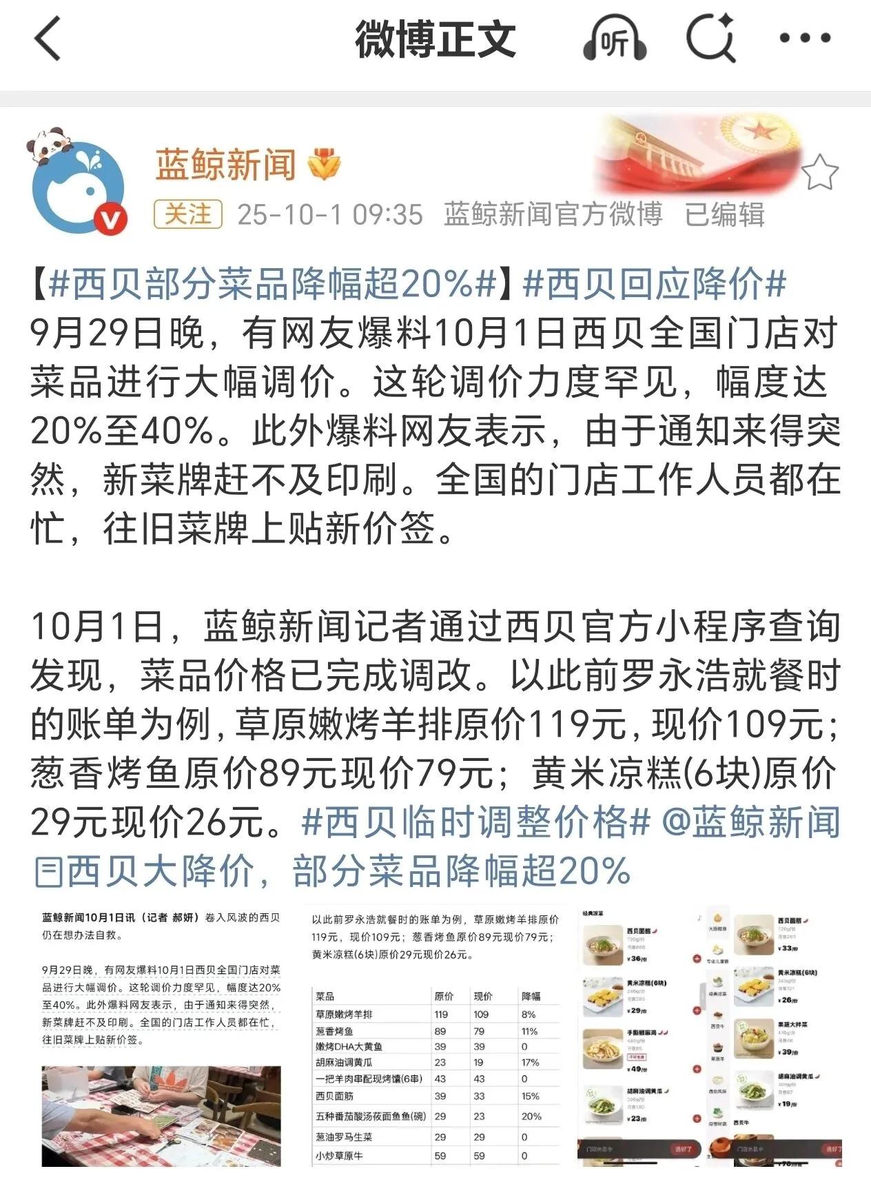 西贝降价,网友炸锅。没想到十一长假第一天,西贝就悄无声息扔出惊喜,多个热门菜品下调了价格,比如原来119的烤羊排降到109,葱香烤鱼从89降到79,26块的黄米凉糕降了3块钱等等,总体来看,多数降价菜品幅度在20%-40%不等。不禁令人诧异,贾国龙这变的也忒快了吧! 而且西贝还有一个重大改变,那就是沙漏计时上菜时长,明显较之前用时更长了。这可以说是贾国龙为向外界展示西贝不用预制菜,已完成了此前承诺的将更多菜改为门店现做的一大决心。有网友表示个别西贝门店的菜单还没来得及更改,买单价却会按下降后的来算。 此前贾国龙对外宣称的动作,也仅是提出了几大承诺,包括儿童餐等菜品放到现场厨房现做,并未提及降价笼络人心。这次突然降价,西贝也没有任何公开表示,表明西贝和贾国龙被最近这一连串风波搞怕了,宁可给消费者一个惊喜,也不想因说错话而再次被锤。
