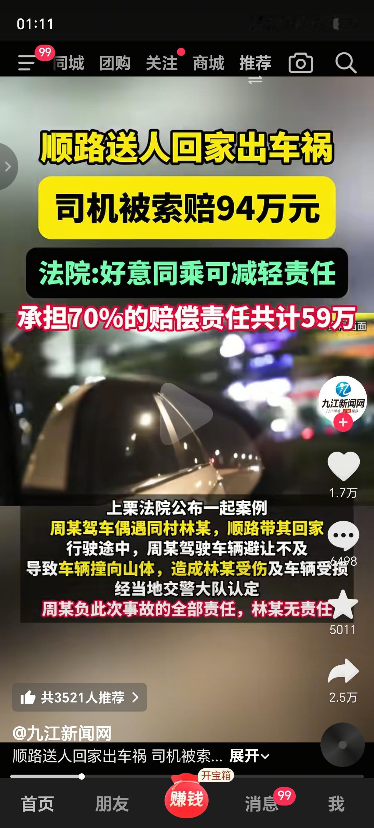 好人不能随便做,尤其是遇到搭顺风车的人能避开就避开。如今都是自己打车,或者叫网约车。为了省钱蹭别人的车,如果是俩人感情好还可以,遇到不认识的蹭车人就应该躲得远远的,要不然要是出了啥问题不但没有感谢。还会惹的一身腥。 事情是这样的; 2024年深秋的一个傍晚,周某驾车从镇上办事返程,途经村口时遇见同村的林某正站在路边等车。“这天快黑了,我顺道送你回家。”出于同乡情谊,周某主动邀请林某上车,全程未提任何费用。谁也没想到,这段不到10公里的路程,会酿成改变两人命运的悲剧。 行至一段连续弯道时,周某为避让对向突然占道的电动车,猛打方向盘导致车辆失控,径直撞向路边山体。剧烈撞击中,副驾驶座上的林某因未系安全带,头部重重撞在挡风玻璃上,当场昏迷。周某虽只受轻伤,但看着满脸是血的林某,瞬间慌了神,当即拨打120和122报警。 经医院全力抢救,林某脱离生命危险,但诊断结果显示其颈椎骨折伴脊髓损伤,最终司法鉴定为六级伤残。交警部门出具的事故认定书明确:周某在此次事故中未保持安全车速,避让操作不当,负全部责任;林某无任何过错。 2025年初,林某一纸诉状将周某及车辆投保的保险公司告上法庭,索赔医疗费、残疾赔偿金、护理费、精神损害抚慰金等各项损失共计94万余元。“我是好心免费带他,又不是故意撞车,凭啥让我赔这么多?”周某在法庭上情绪激动,认为自己的善意不应换来巨额赔偿。 法院审理时明确,周某的行为构成“好意同乘”——即驾驶人基于善意互助,允许他人无偿搭乘非营运车辆的情谊行为。根据《中华人民共和国民法典》第一千二百一十七条规定,此类情形下发生事故且属于机动车一方责任的,应减轻驾驶人赔偿责任,但不能完全免责,除非驾驶人存在故意或重大过失。 经核算,林某的合理损失共计84万余元。保险公司先在交强险限额内赔付19.8万元,剩余64万余元需按责任划分承担。考虑到周某系无偿搭载,且无酒驾、超速等重大过失,法院最终酌定其承担70%的赔偿责任,需支付45万余元,加上保险未覆盖的部分,总计赔偿59万余元;林某因未系安全带未尽到自我保护义务,自行承担30%责任。 判决生效后,周某四处筹措赔偿款,原本殷实的家庭瞬间陷入困境。他的经历也给