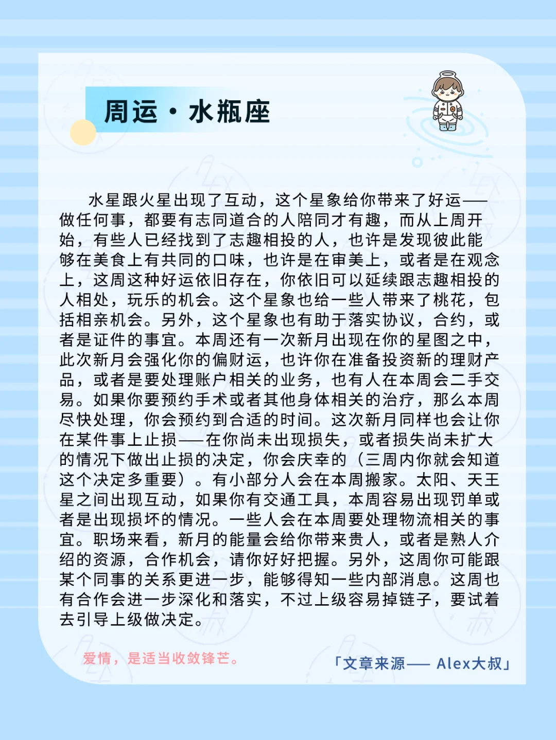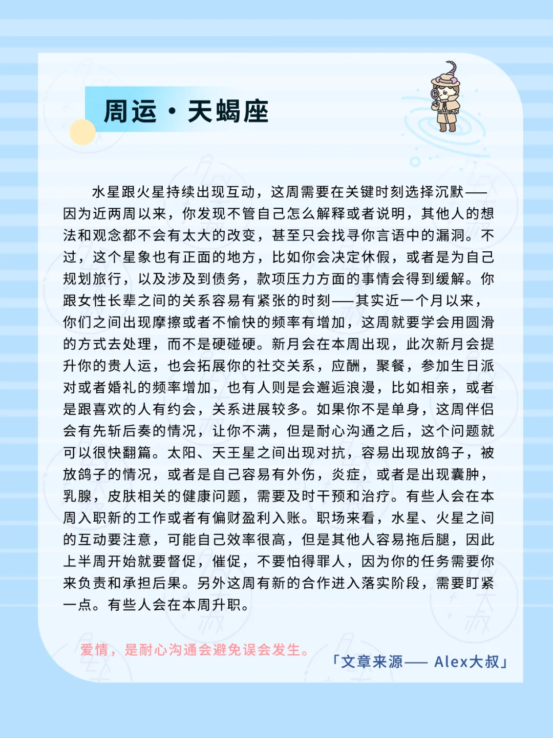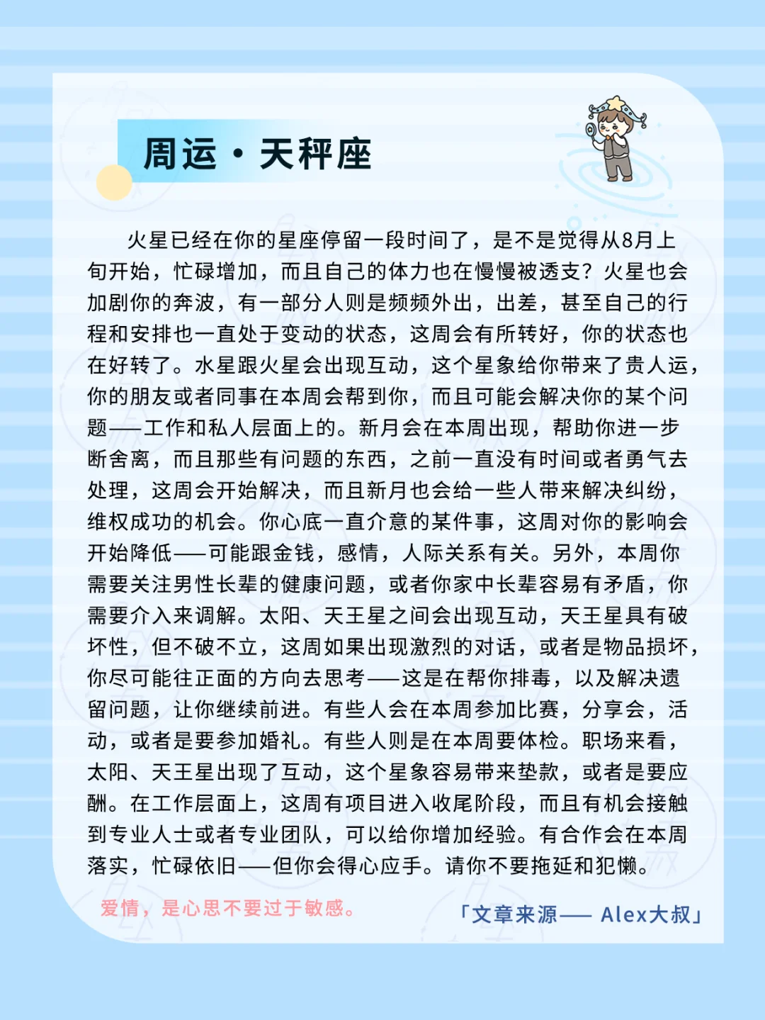 太阳、天王星会在本周出现对抗的星象,天王星的状态不稳定,而且随着行进到特殊的度数和位置,也预示着会有不可抗力的因素,导致我们的计划和安排出现变化,比如提前,推迟,甚至取消。如果本周有出行的计划,出现延迟,延误的概率会大大增加。