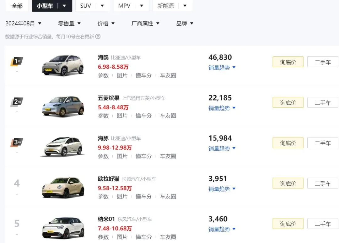 而飞度的销量下滑,其实原因就一点,被国产电动小车打趴下了,看看8月份的小型车销量排行榜,几乎被国产纯电小车霸榜了。