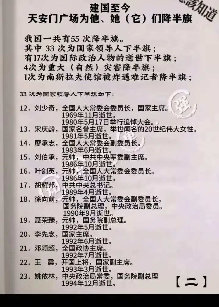 建国至今,共有55次国旗为其下半旗志哀!其中共有33位国家领导人享此殊荣,今天列举23位。剩余10位领导人,你知道是谁吗?评论区告诉我。