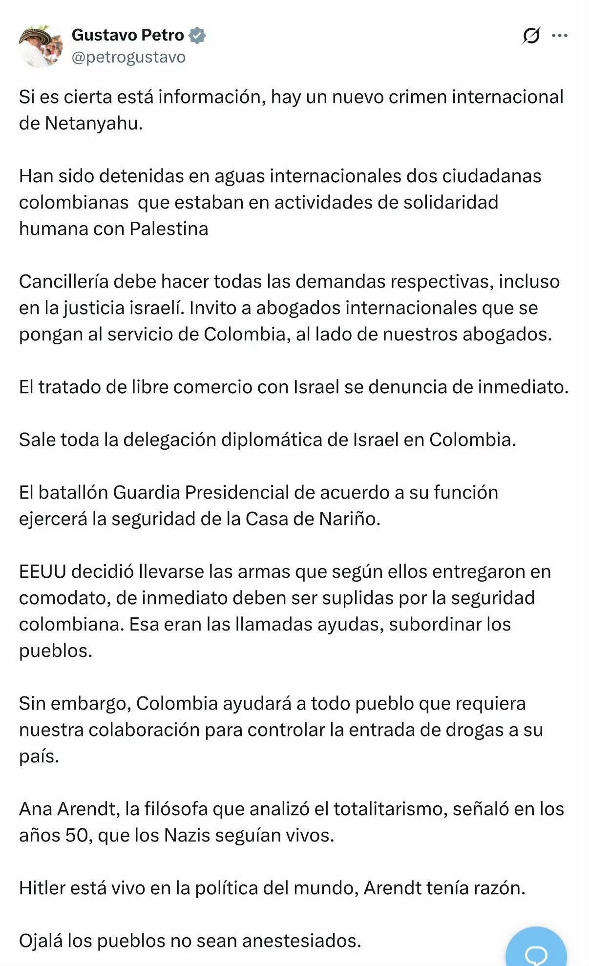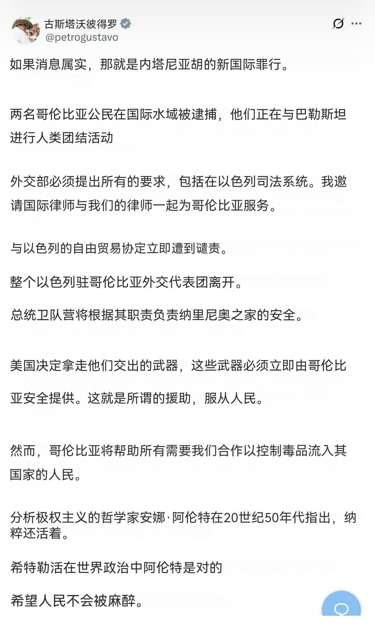 哥伦比亚总统佩特罗最新个人社媒发文:由于以色列海军在国际海域拦截加沙援助船队,逮捕包括两名哥伦比亚公民在内的国际人士,佩特罗表示要驱逐以色列外交官,要废除以色列和哥伦比亚的贸易协议。佩特罗有点刚,一方面可能是美国吊销了他美国签证,所以把气撒在以色列身上。另一方面确实看不惯以色列一系列作为,要与之过割席断交。比起意大利梅洛尼,哥伦比亚佩特罗有血性的多。梅洛尼前面以为国内抗议,所以派出护卫舰运送人道物资到加沙,但在美以的联合重压之下,已经于当地时间9月30日,宣布撤回为“全球坚韧”加沙救援船队护航的护卫舰。