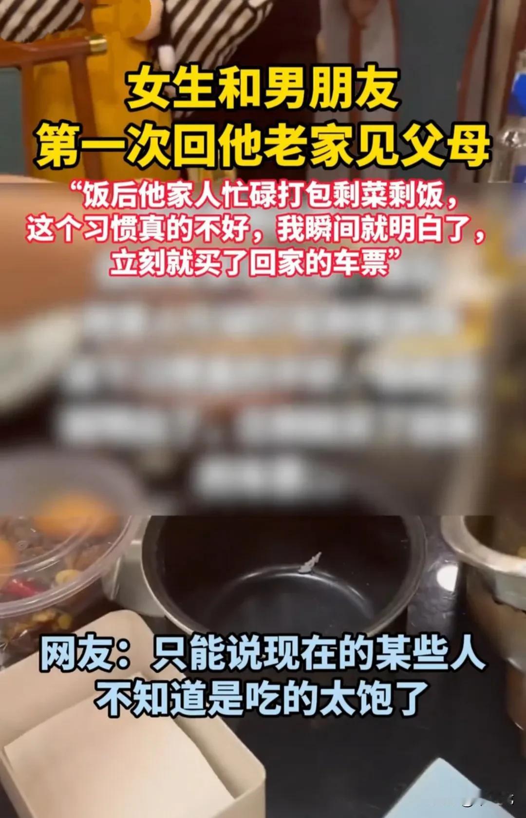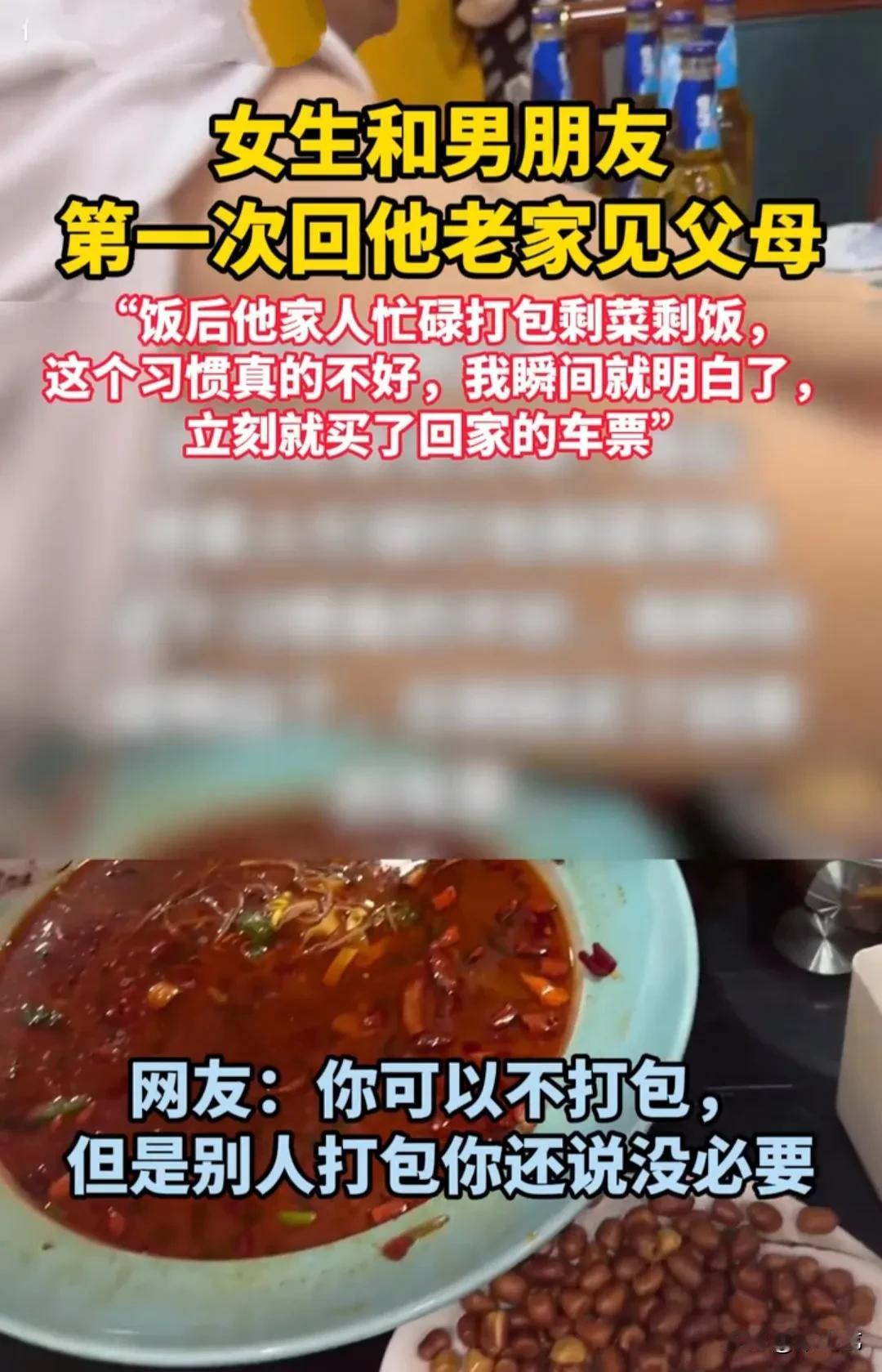 女孩第一次跟着男朋友回老家,在男方家,女孩受到了男方父母的热情接待,吃饭时间,男方全家陪着女孩一同上馆子。 饭后男方父母做了一件事,让女孩一分钟都不愿再待,立马买票踏上了返程之路。 因为女孩是第一次上门,为了显示对女方的重视,晚饭时间,男孩父母特地上馆子点了丰盛的一桌,鸡鸭鱼肉琳琅满目。 餐桌上,男方家人生怕怠慢了女孩,不停地给女孩添饭挟菜,关怀备至。气氛非常热烈,女孩戒备心理慢慢放下了。 酒足饭饱之后,男孩父母做了这样一件事,女孩脸上的笑容瞬间消失了。 刚刚吃完,男孩父母就让服务员拿来塑料袋和一次性饭盒,将餐桌上未吃完的剩饭剩菜全部打包带走。 外出吃饭,吃剩的饭菜打包带走是很正常的,女孩不是不能理解。 但今天不同,这是双方第一次见面,对女孩子来说,这是一个很重要的时刻。今天还打包,就有点不合适了,说明男方家对女孩并不重视,第一次见面就这样小家子气,婚后一定会变本加厉。 这样的家庭,还是尽量远离。 一想到这里,女孩再也坐不住了,在男友父母面面相觑中,女孩不顾男友的劝阻,执意踏上了回程之路。 女孩将这段经历吐槽到网上,以为会引起网友的共情,没想到网上却是一片冷嘲热讽。 大多数网友觉得,男方父母并没有做错。 有网友说,外出点餐吃饭,吃不完的打包带回去,能吃就吃,不能吃的喂猫喂狗,很正常呀,浪费才可耻。 有网友说,自己家人吃饭打包很正常,有客人在才不会打包,他当着你的面打包,正说明他没将你当外人,而是当成了自家人。勤俭节约是中华民族的传统美德,人家打包并不说明人品就有问题,你在意这件事,只能说明你对他不是真爱。 我发现一个有趣的现象,如果打包的是有钱人,人家会称赞你节俭、低调,有家教。如果打包的是穷人,人家就会觉得丢人。 结果呢,有钱人大大方方的小气,穷人小心翼翼的大方。 有些人觉得打包没什么,有些人觉得丢脸了,这是三观不合,三观不合没必要在一起,在一起以后也会成为吵架的理由,除非是真爱,能相互包容。 (素材来源:智慧生活报)