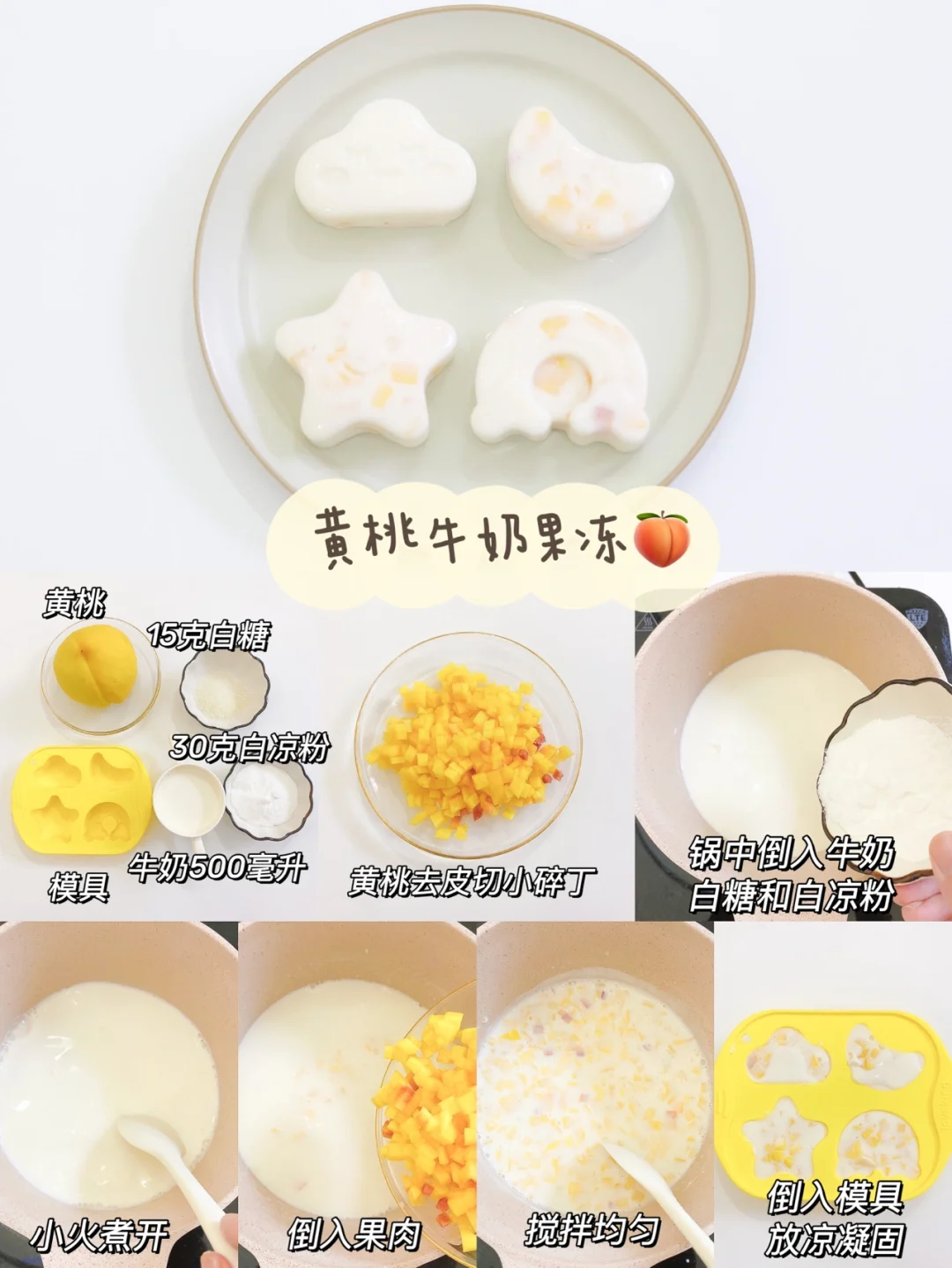 💕食材:黄桃、15克白糖、30克白凉粉、牛奶500毫升