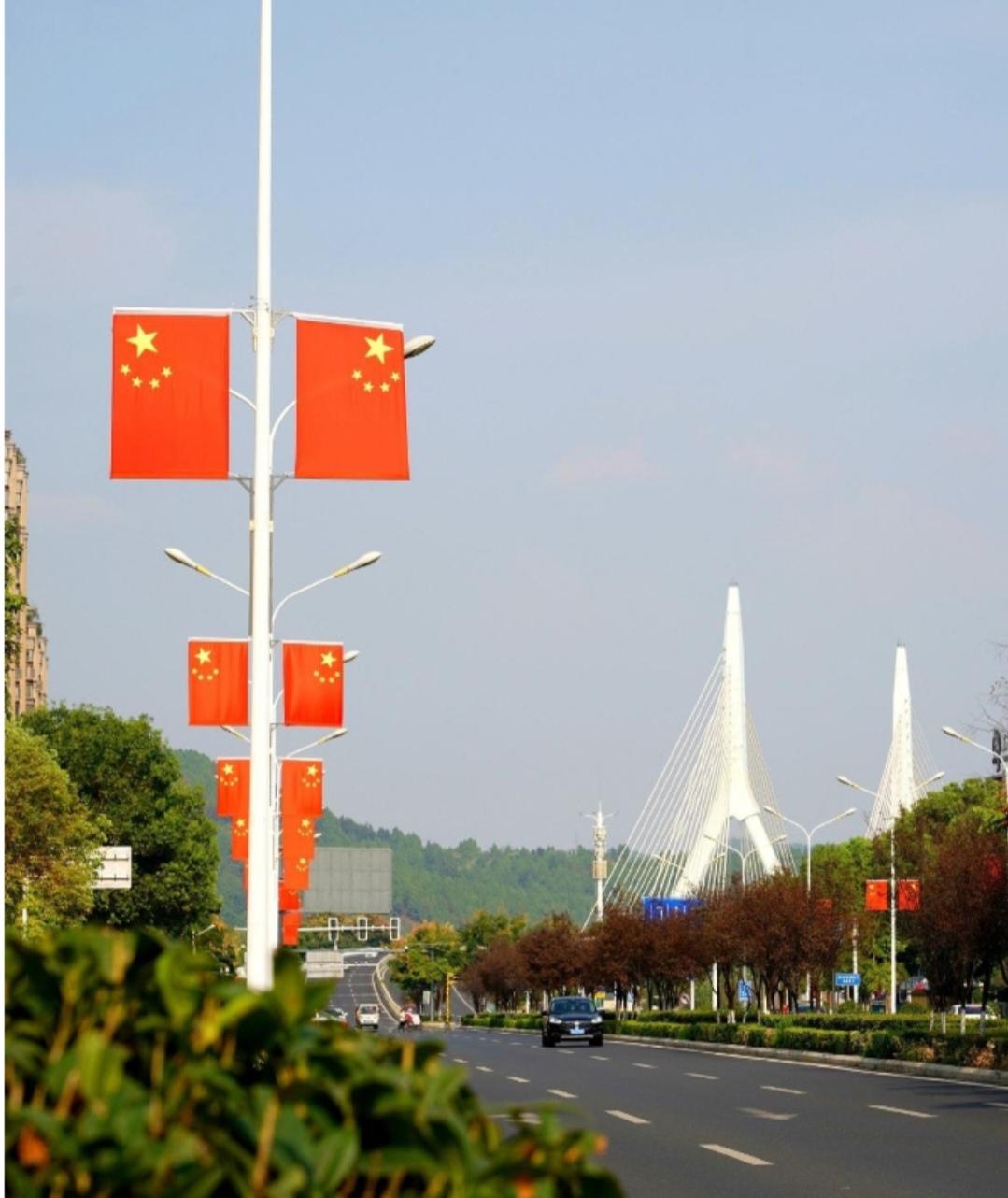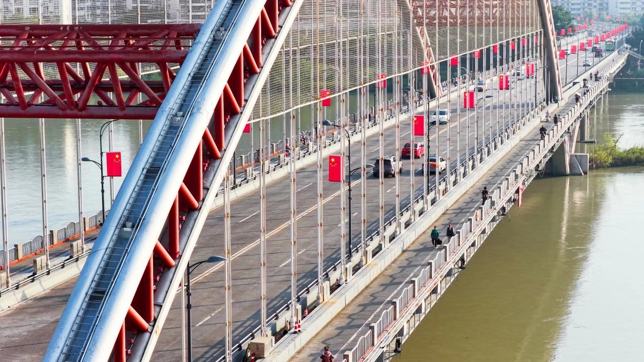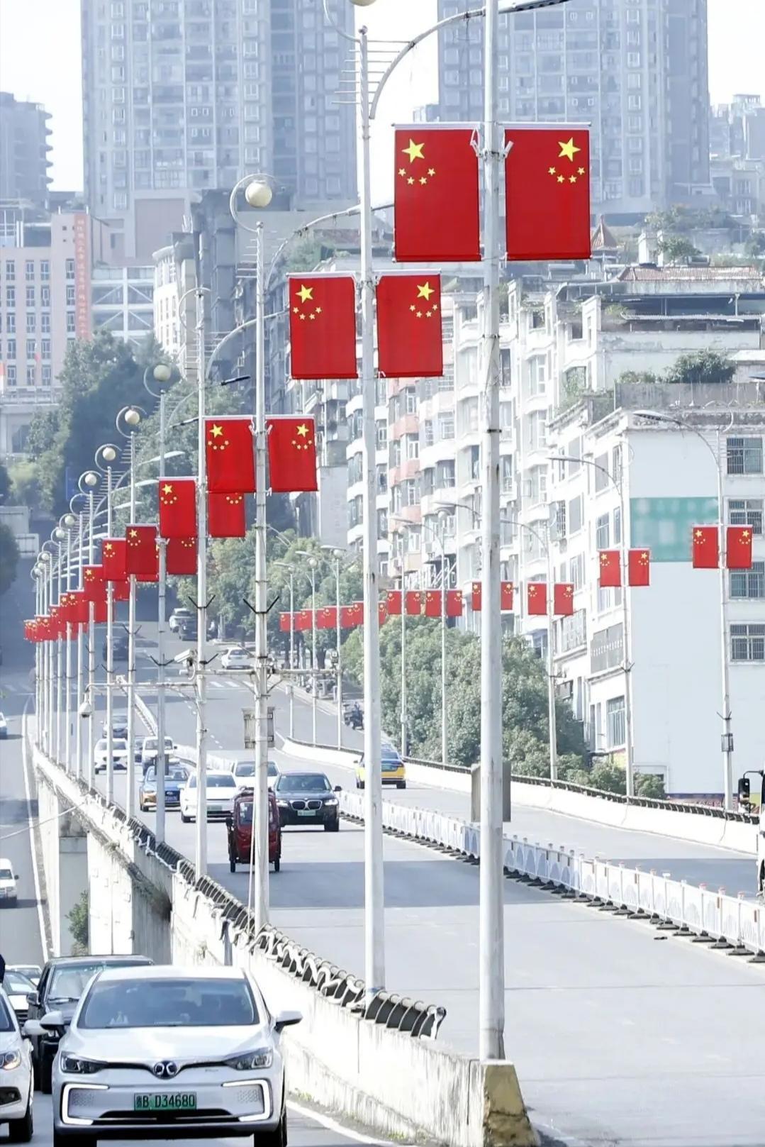 庆十一,绵阳满城尽染“中国红” 有一种感动,名为“中国红”;有一种激动,唤作“五星红旗”。节日期间,市区的主要干道与街区皆挂满了国旗,为这座城市添上一抹艳丽的红色,装点着这座美丽而古老的城市。 宛如白色玉带的东方红大桥旁,在红星红旗的映衬下,城市地标越王楼格外醒目,高高耸立。 洁白似能入云的绵阳一号桥旁国旗猎猎,红白相间光彩夺目。 目睹街头巷尾处处飘扬的五星红旗,一种强烈的归属感与自豪感便会涌上心头。国家繁荣昌盛,人民生活美满,国泰民安,身为国人,我们为国家的强大而倍感骄傲。