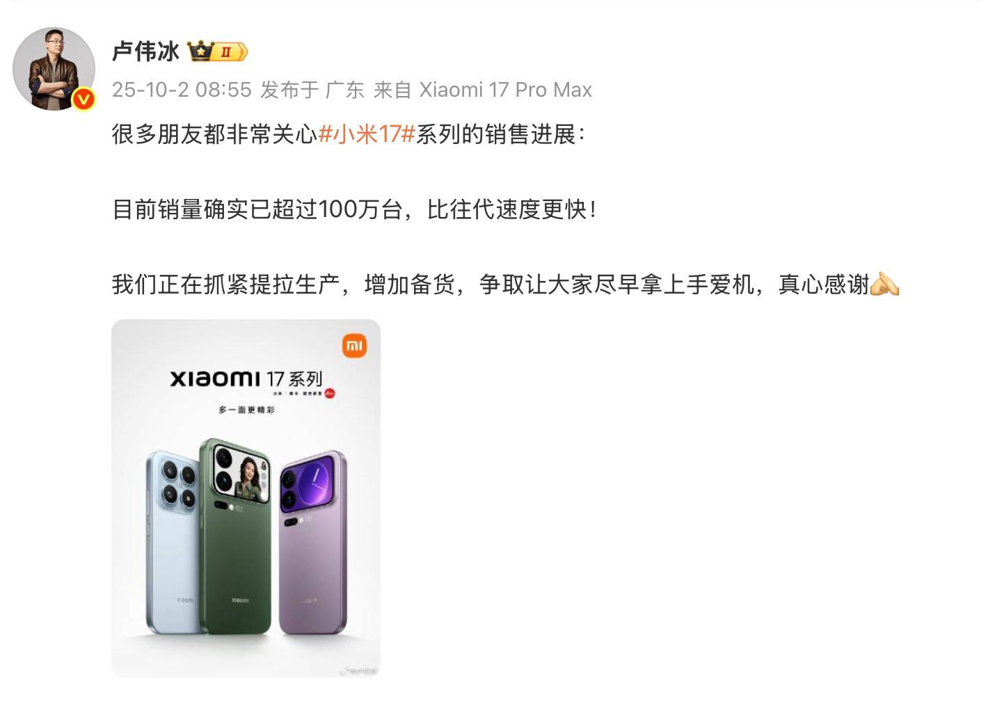 来自卢总的确定消息,小米17系列销量超过了100万,正在加紧拧螺丝了。
