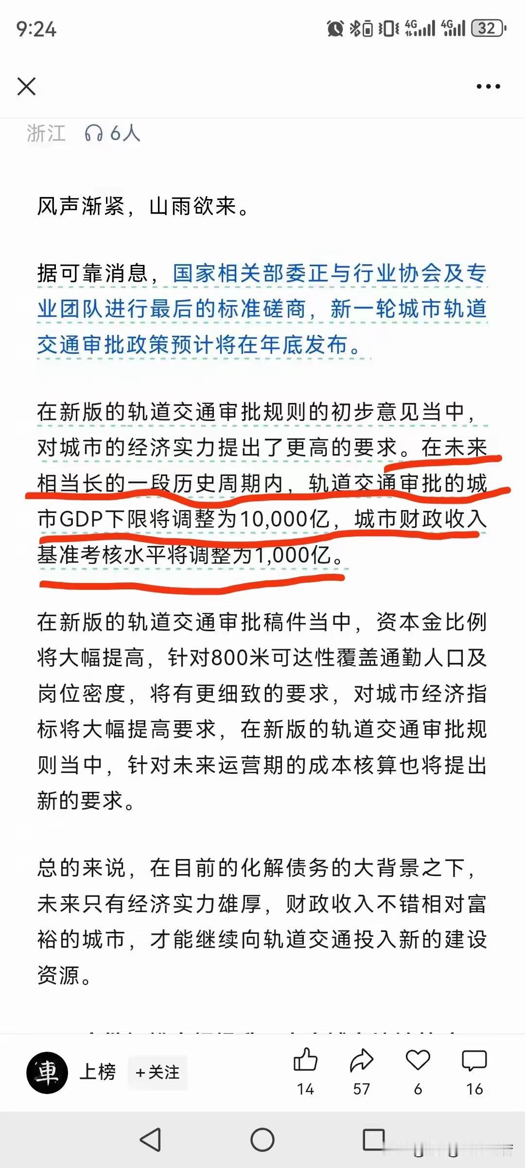 关于柳州轻轨,究竟是续建还是拆除? 直接说结论吧(尽管与某些人的愿望相悖):再建几无可能了。 新一轮轨道交通审批门槛提高,预计将提升至GDP一万亿、财政收入一千亿以上。而柳州24年的GDP二千九百多亿,财政收入一百五十亿左右,柳州一直以来津津乐道的全区GDP第二无人追上成了一个“梗”。 此外,未批先建问题严重,官方已有结论:“经过反复、深入的科学论证,继续推进该城市轨道交通项目已不可行,通过改造整体利用也不可行。” “必须深刻反省、引以为戒,放弃幻想、坚决整改,坚持把城市轨道交通项目综合整治作为重要政治任务和重要民生事项,全力整治“烂尾工程”。” 当前广西正全力支持柳州化债,债务沉重的柳州应把可持续发展作为第一要务,“虚荣的”轻轨必然要“壮士断腕”了。
