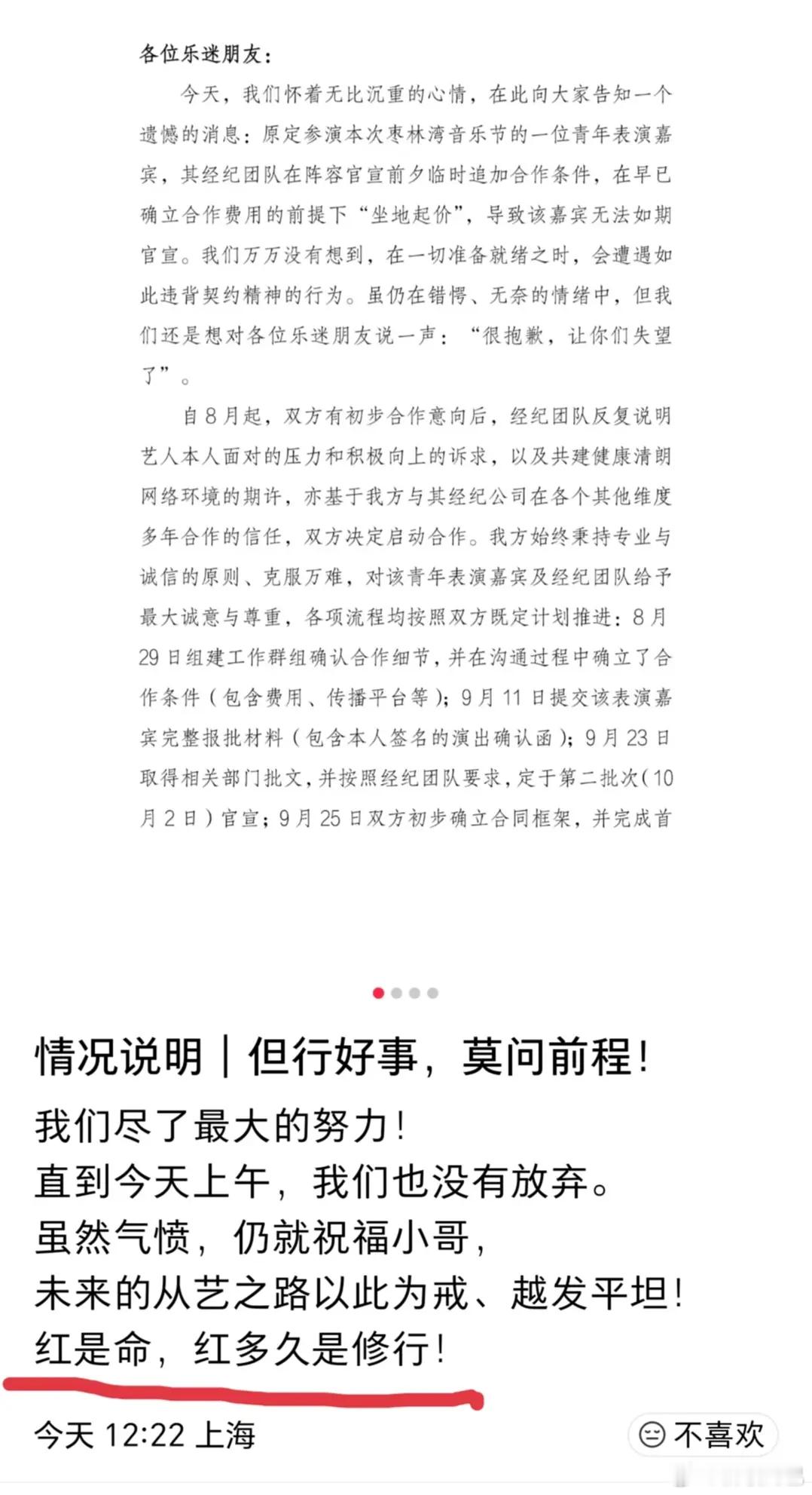 有艺人在音乐节临时坐地起价被官方挂了关键词:音乐节首秀,演员,经纪公司是大公司