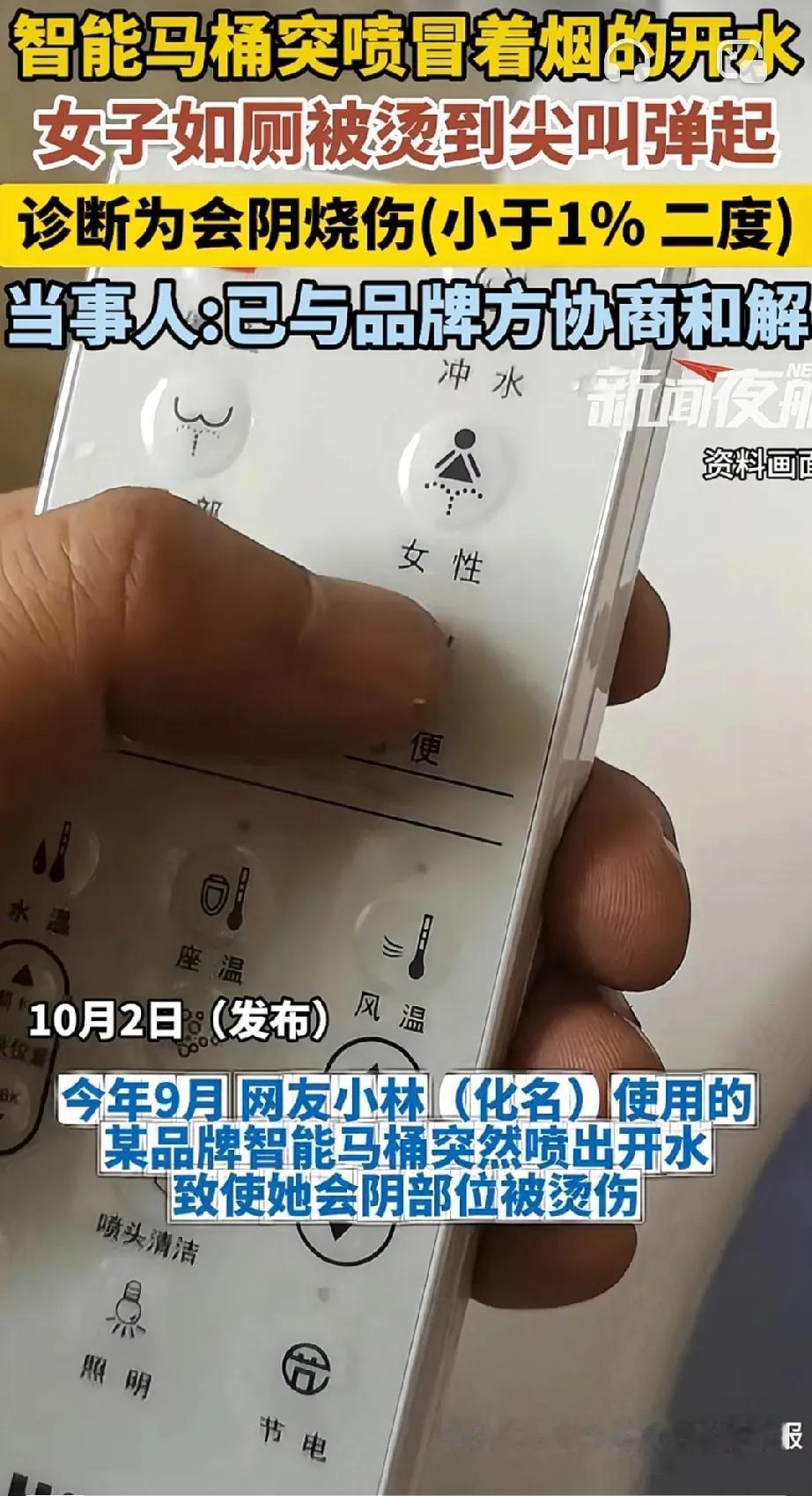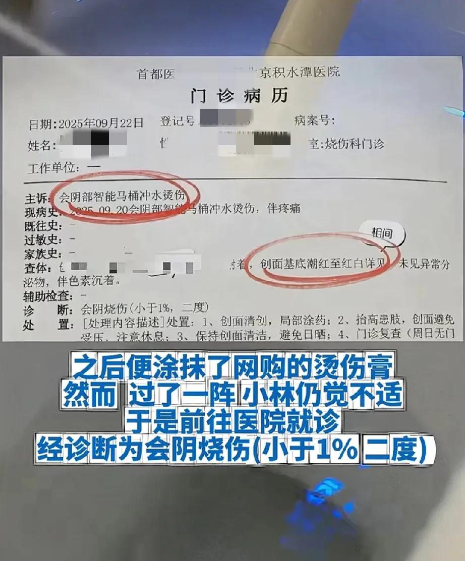网友用智能马桶冲洗被烫伤,这可得注意了⚠️第一次听说智能马桶喷热水的。 今年九月份的时候,网友在上完厕所的时候,按下了智能马桶的冲洗键,没想到马桶仿佛卡住了没动静,几秒后,智能马桶喷出了“冒着白烟”的热水。 网友被烫的弹了起来,尖叫了很久,随后赶到医院,部位被确诊被二度烧伤…… 没想到,马桶卡了顶多不工作,不接受指令,没找到还能癔症,这可是身体特别敏感娇嫩的部位,热水直接喷洗,肯定会烫伤。 大家用智能马桶的,可得注意了,万一有类似卡住的情况,一定要先离开马桶。防止被烫伤。