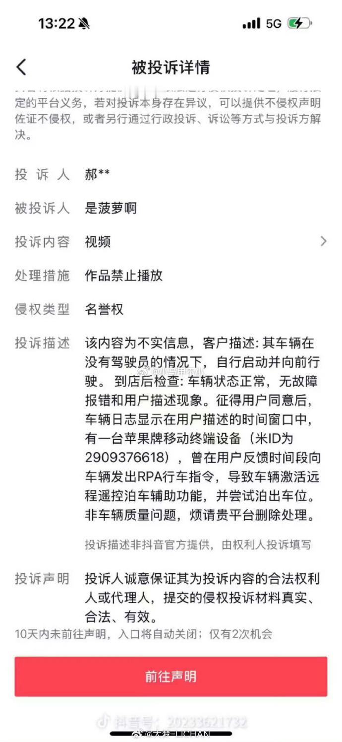 车辆日志显示在用户描述的时间窗口中,有一台苹果牌移动终端设备(米ID为29****6618),曾在用户反馈时间段向车辆发出RPA行车指令,导致车辆激活远程遥控泊车辅助功能,并尝试泊出车位。