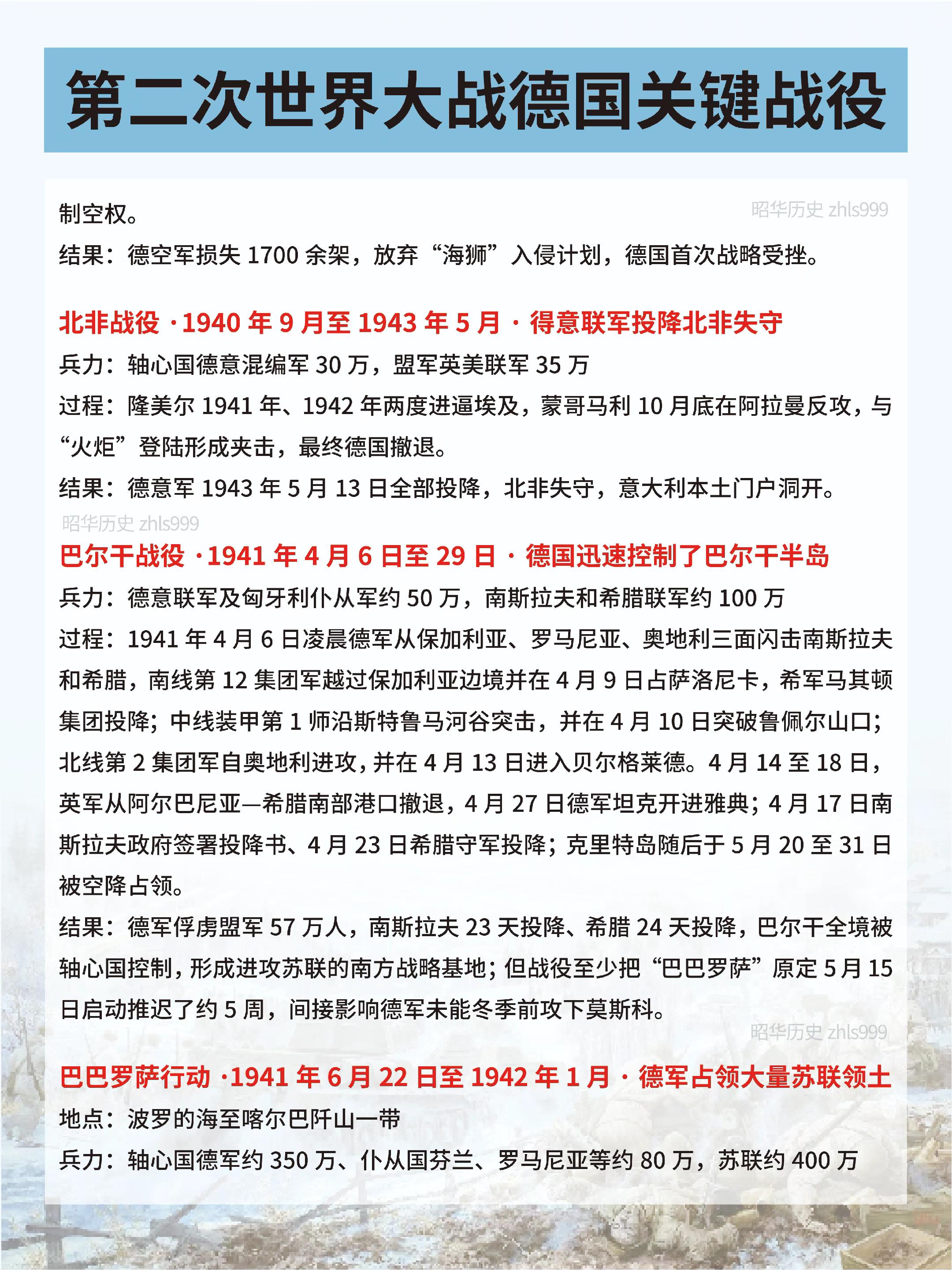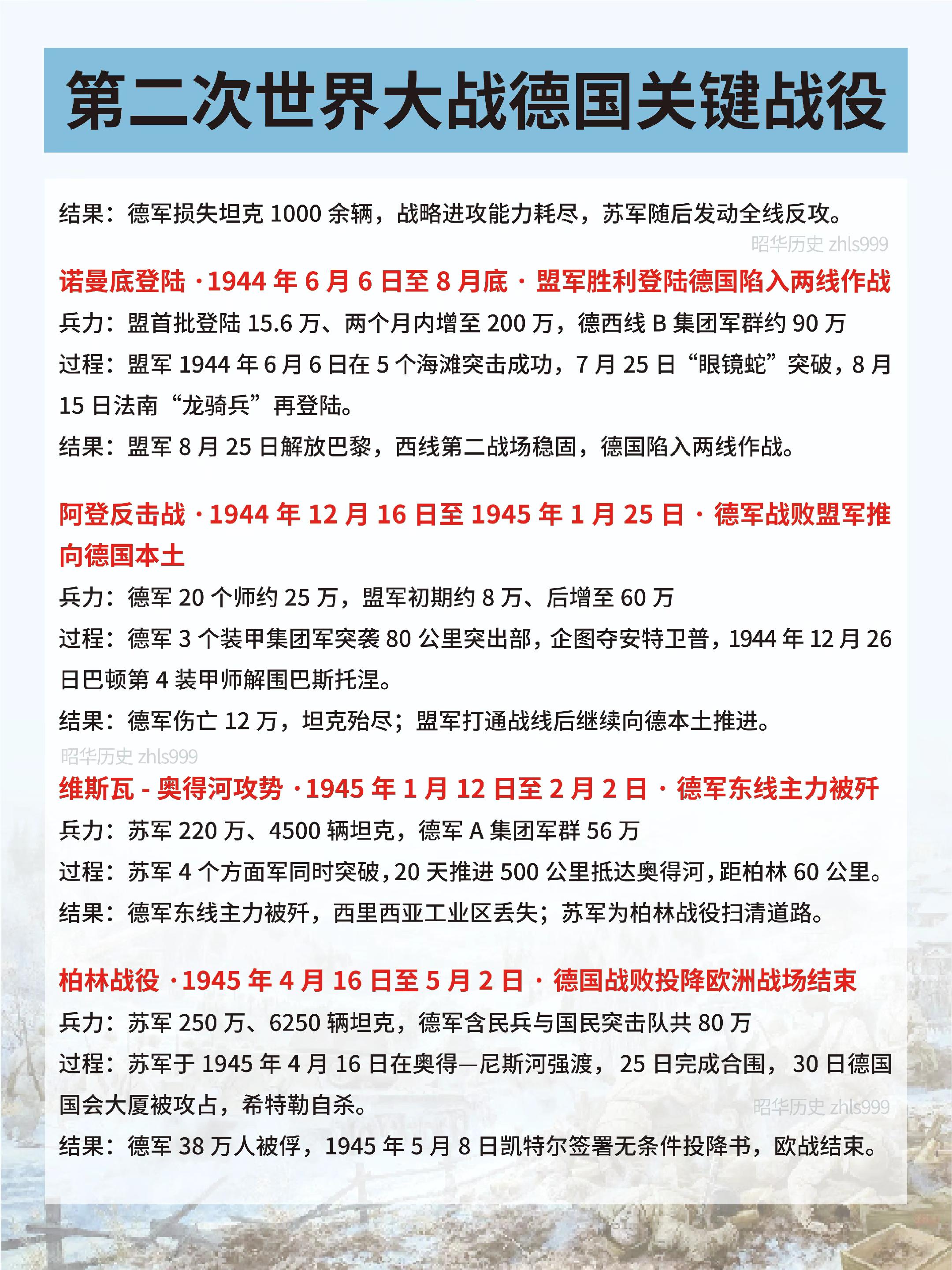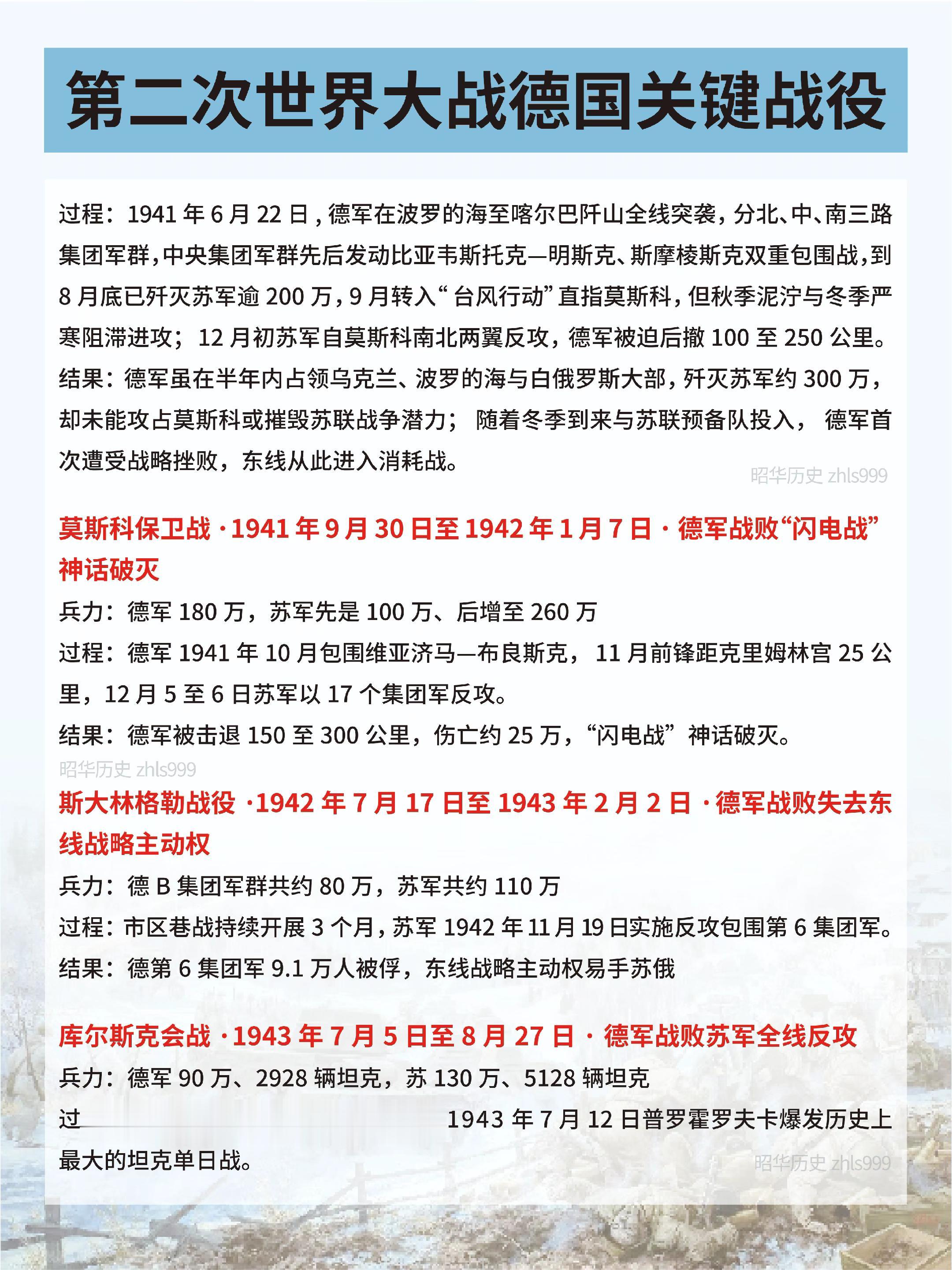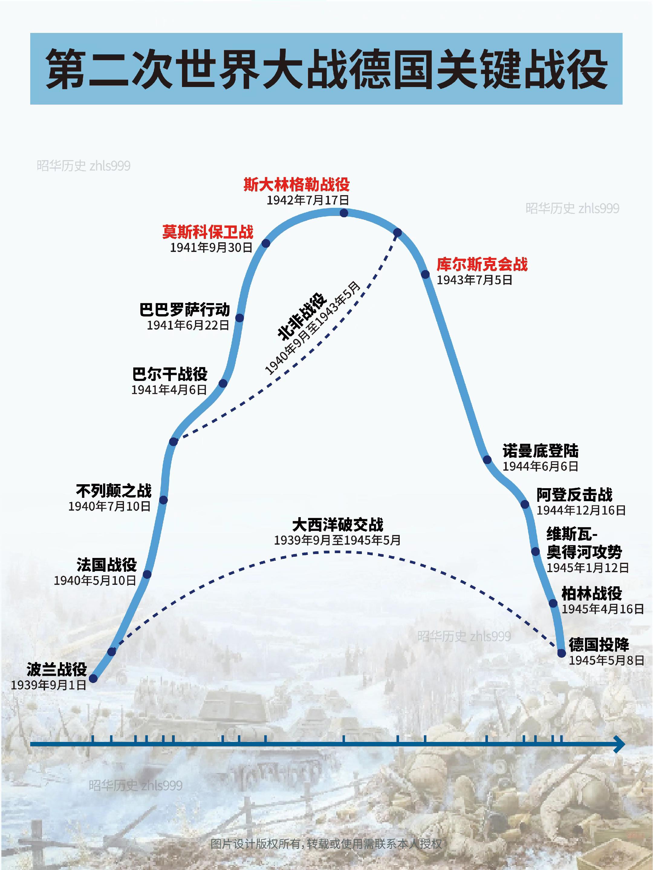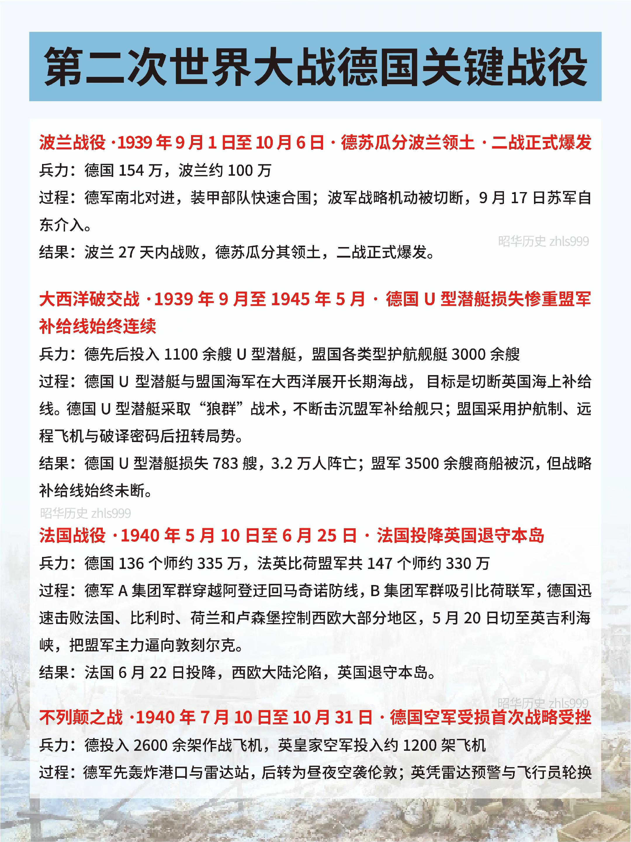 二战中德国关键战役汇总。🔵波兰战役·1939年9月1日至10月6日·德苏瓜分波兰领土·二战正式爆发 兵力:德国154万,波兰约100万 过程:德军南北对进,装甲部队快速合围;波军战略机动被切断,9月17日苏军自东介入。 结果:波兰27天内战败,德苏瓜分其领土,二战正式爆发。 🔵大西洋破交战·1939年9月至1945年5月·德国U型潜艇损失惨重盟军补给线始终连续 兵力:德先后投入1100余艘U型潜艇,盟国各类型护航舰艇3000余艘 过程:德国U型潜艇与盟国海军在大西洋展开长期海战,目标是切断英国海上补给