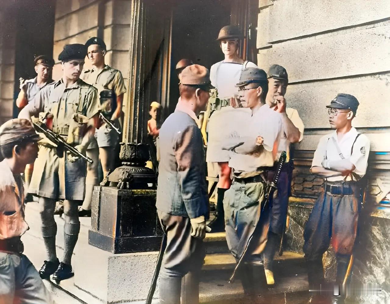 这应该是日本鬼子缴械投降时的画面,但是从这个画面当中也能够看得出来,日本鬼子身上的军刀并没有上缴,还在它们身上挎着,虽然身上已经没有枪支了,但是这些日本鬼子看起来一点都毫无惧色,哪怕是看押它们的人都端着枪,可是这些贼眉鼠眼的日本鬼子,好像还是七个不服,八个不愤,根本就没把这些端枪的人放在眼里,可见当时的日本鬼子是非常狂妄的!