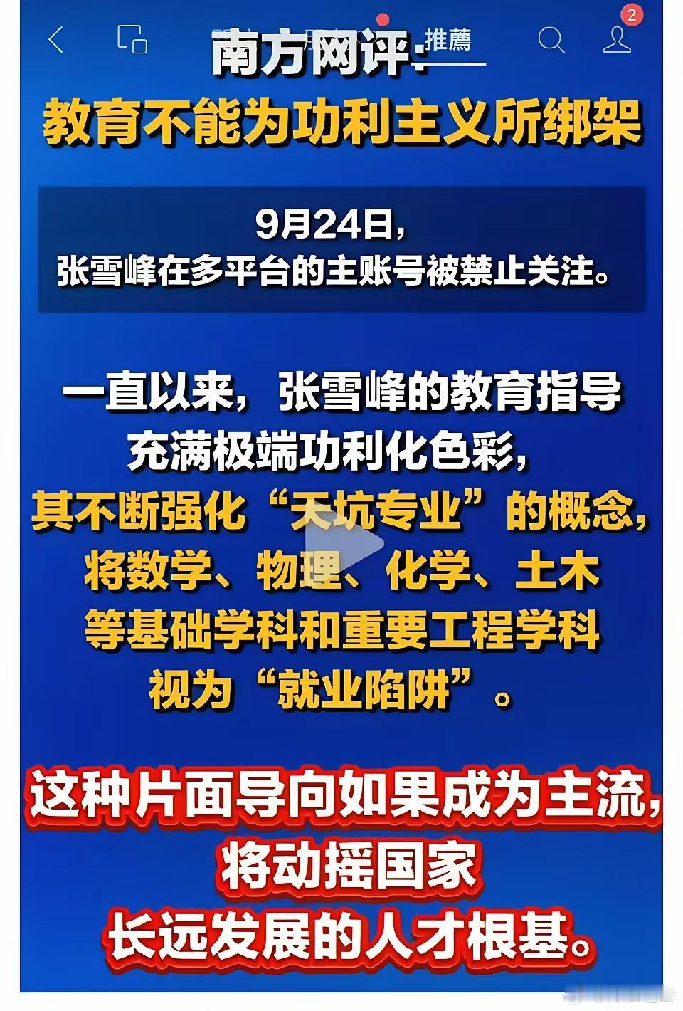 教育不能被功利主义所绑架,说的好 可是上学不就是为了更好的前途,赚更多的钱吗?央视广告都说知识改变命运,不就是这个意思嘛! 如果研究生毕业都没有好工作,都只拿几千块,那我读那么高的学历干嘛呢?改变谁的命运?我侄子本科学新媒体,研究生学哲学,毕业进入懂车帝,当初选择哲学是不是太盲目了? 张雪峰或许太功利了,但是很现实啊。封杀了张雪峰难道这些事实就不存在了吗?让学生在选择专业之前就了解这个专业,不应该是就业指导的典范吗? 有教无类,尖端科学应该让尖端人才进入,普通领域就让普通人才进入,这才是人才使用的正确观念吧。 国家应该实行的是宽进严出的政策,不是什么人发两篇论文都能成为硕士 博士的,水分也太大了,搞那么多研究生出来,有几个能研究出有用的东西的?简直就是浪费资源,增加家庭的学习成本。 雪峰不在了,但是市场还在,需要指导的学生也还在,想要留住人才就该给人才应有的待遇。你说呢?