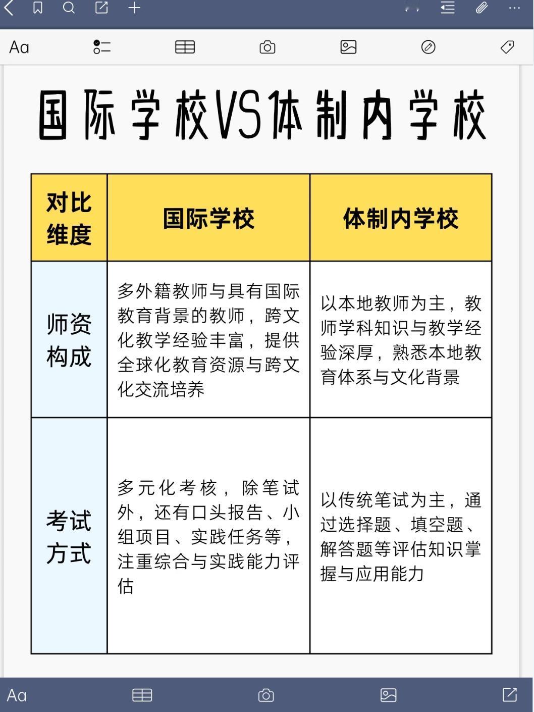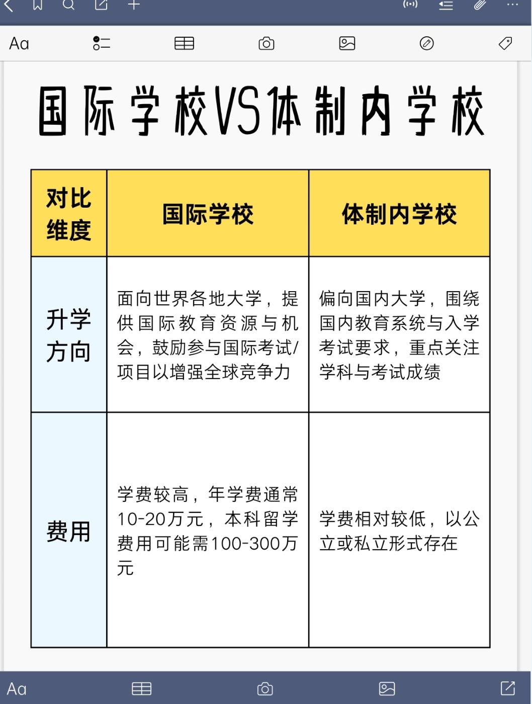 国际学校VS体制内学校:择校背后是教育路径的人生选择 给孩子择校,是很多家庭绕不开的难题。国际学校和体制内学校,就像两条通往不同方向的教育之路,今天咱们就从升学、费用、师资、考试这几个维度好好聊聊,帮大家看清其中的差异。 升学方向上,国际学校瞄准的是世界各地的大学,提供的是国际教育资源和机会,鼓励学生参与国际考试、国际项目,以此增强全球竞争力。比如很多国际学校会开设IB、AP、A-Level课程,学生可以凭借这些课程成绩申请海外名校。而体制内学校偏向国内大学,围绕国内教育系统和入学考试要求,重点关注学科与考试成绩,高考是绝大多数学生的升学通道,目标是国内的本科、硕士院校。 费用方面,国际学校的学费较高,年学费通常在10-20万元,要是本科阶段出国留学,费用可能需要100-300万元。这对家庭的经济实力是不小的考验。体制内学校学费相对较低,公立学校学费更是亲民,私立体制内学校学费虽然比公立高,但和国际学校比起来还是有差距。 师资构成上,国际学校多外籍教师和具有国际教育背景的教师,他们跨文化教学经验丰富,能为学生提供全球化教育资源和跨文化交流培养。学生在课堂上能接触到不同国家的文化、教育理念。体制内学校以本地教师为主,这些教师学科知识和教学经验深厚,熟悉本地教育体系和文化背景,对国内的考试大纲、教学重点把握得非常精准。 考试方式也有很大不同,国际学校采用多元化考核,除了笔试,还有口头报告、小组项目、实践任务等,注重综合与实践能力评估。学生的成绩不是只靠一张试卷决定,平时的课堂表现、项目成果都很重要。体制内学校以传统笔试为主,通过选择题、填空题、解答题等评估学生的知识掌握与应用能力,考试成绩在升学、评优中占主导地位。 选择国际学校,意味着孩子未来大概率要走留学之路,要适应不同的文化和教育环境,家庭也需要承担较高的经济成本,但孩子能获得更广阔的国际视野和多元的发展机会。选择体制内学校,孩子走的是国内成熟的教育路径,升学体系清晰,文化认同强,经济成本相对较低,但也面临着国内升学的竞争压力。 其实,没有绝对的好坏,只有是否适合。每个家庭的经济状况、孩子的性格特点、未来的规划都不一样,择校的选择也会不同。 你会给孩子选择国际学校还是体制内学校呢?你觉得哪种教育路径更适合孩子的成长?国际学校 国际初中择校 公立高中国际部 国际化教育学校 择校国际本科 国际公立院校 国际教育竞争