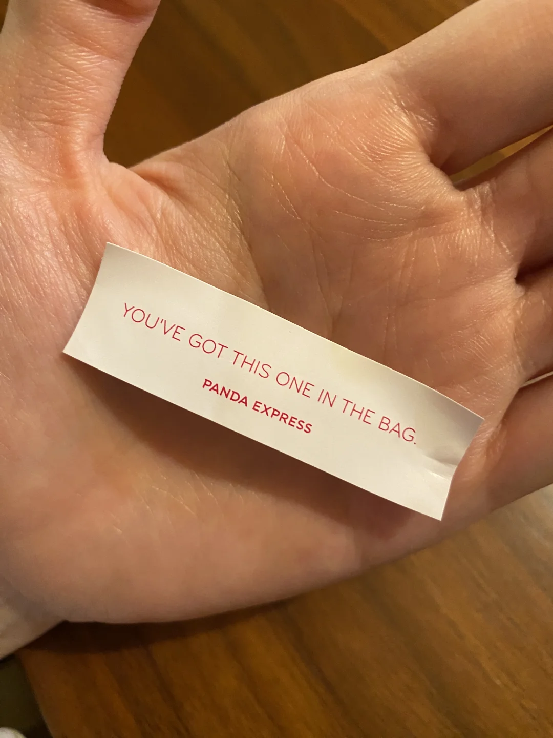 今天妹妹说,妈妈,请给我fortune cookie (幸运饼干🥠,美国中餐馆特色,饼干里面有个小纸条)。 我说一边拿给她一边说,宝贝,你也是我的fortune cookie喔~😘 妹妹很高兴说,妈妈,你就是外面的cookie(饼干),我就是里面的fortune(幸运)~你就是这样抱着我~ 然后我们打开,里面写了一句话,You’ve got this one in the bag. 💕
