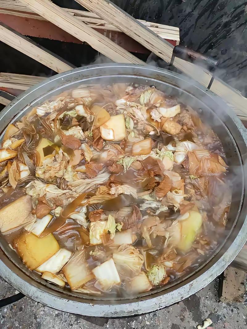 这种熬菜山西称大烩菜。豆腐,臼菜,猪肉,粉条等一起烩一大锅。盛一碗吃二馒头很实惠