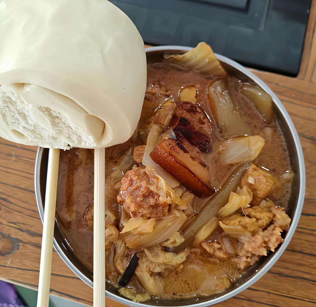 这种熬菜山西称大烩菜。豆腐,臼菜,猪肉,粉条等一起烩一大锅。盛一碗吃二馒头很实惠。也很有营养。在华北地老都很喜欢这种吃法。