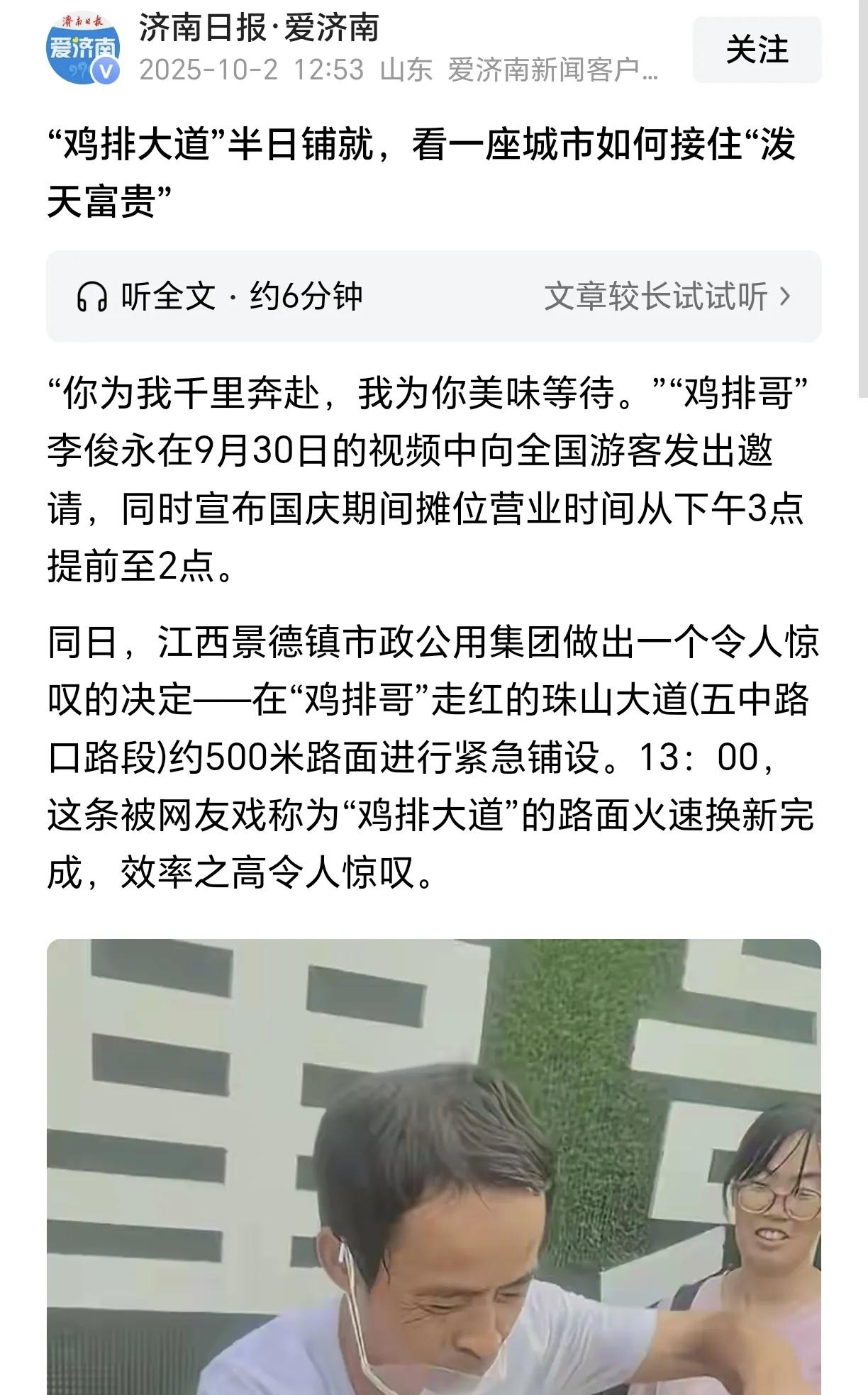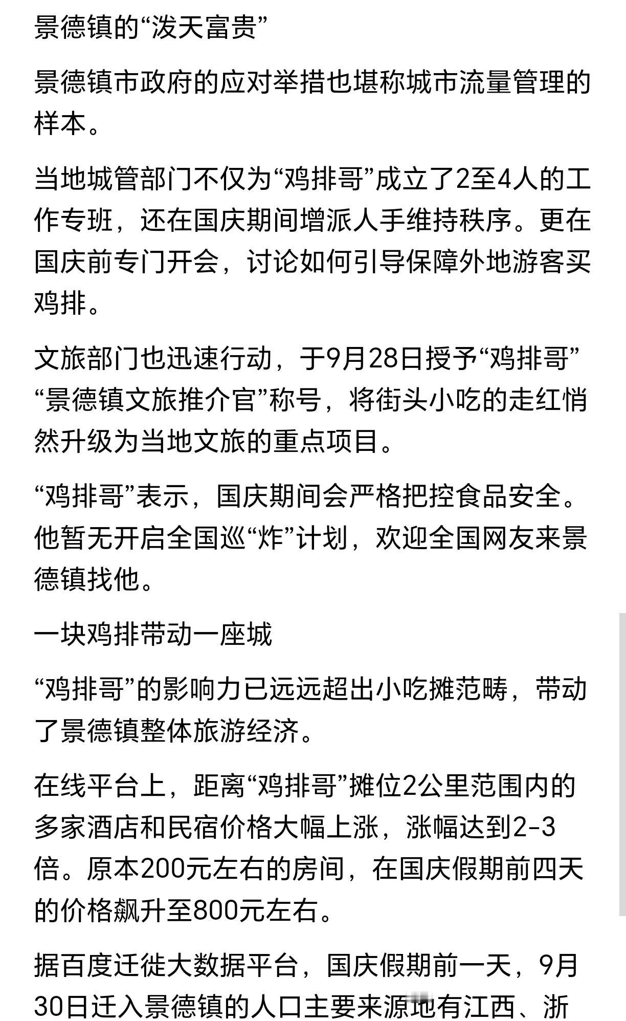 有网友评价说过:他卖6块钱的鸡排,但提供60元的情绪价值,600元的服务。 景德镇都专门给他的鸡排摊位铺设道路、派人维持秩序、讨论如何保证外地游客能买到鸡排。 “鸡排哥”开始的走红如果说只是偶然,那现在更多靠的是“鸡排哥”本人的服务态度、情绪价值和当地政府的配套服务。 这也是现在地方打造文旅特色项目必须的基本条件:有特色,有特产,更要有好的服务态度和配套政策措施。