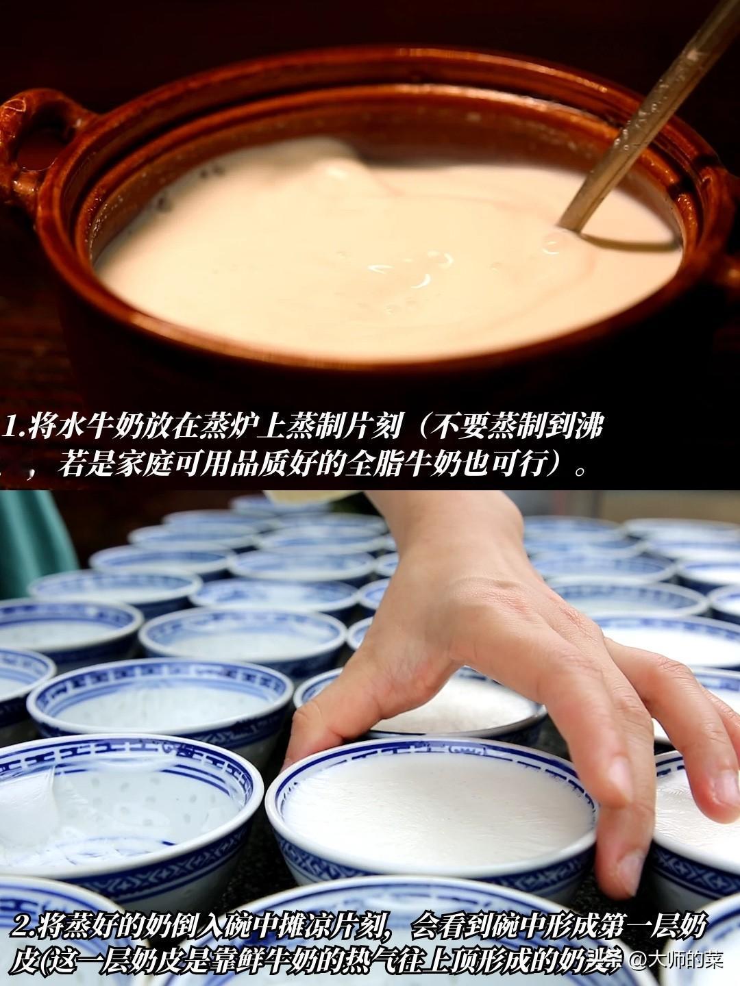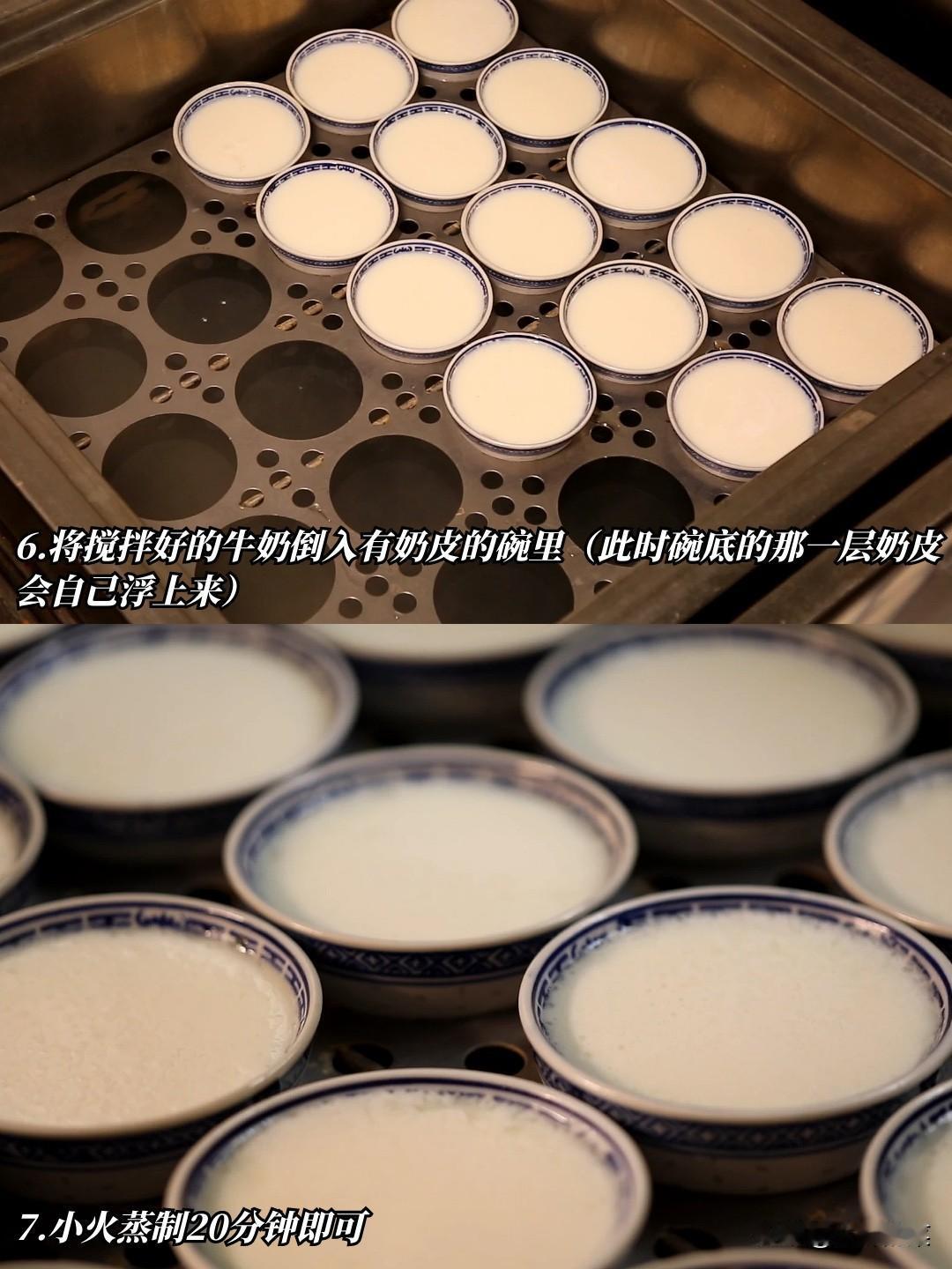 国庆在家学美食——顺德双皮奶!食材家常,做法简单,双层奶皮才是精髓! 👏顺德本地超受欢迎的:周大娘牛乳-第四代传承人·周惠贞大师倾情传授——顺德双皮奶制作教程~ 1️⃣【水牛奶蒸制】 将水牛奶放在蒸炉上蒸制片刻(不要蒸制到沸腾,若是家庭可用品质好的全脂牛奶也可行)。 2️⃣【牛奶摊凉】 将蒸好的奶倒入碗中摊凉片刻,就会看到碗中形成了第一层奶皮。(这一层奶皮是靠鲜牛奶的热气往上顶,而形成的奶皮) 3️⃣【入蛋清搅拌】 将第一层奶皮留在碗底,把奶皮下面的牛奶倒入锅中备用。然后准备鸡蛋清、白糖充分搅拌均匀,然后倒入锅中与牛奶一起充分搅拌均匀。 4️⃣【上锅蒸制】 然后将锅中搅拌好的牛奶倒入有奶皮的碗里(此时碗底的那一层奶皮会自己浮上来)。然后小火蒸制20分钟即可。 🫶表面凝结的两层奶皮,上层甘醇微皱,下层细腻滑嫩,形成层次分明的口感结构。口感介于布丁与豆腐脑之间,嫩滑绵密,勺触即颤,入口即化而不散。每一口都带着醇厚天然的乳香,回味带有类似奶酪的甘甜,真正健康又老少皆宜的小甜品~ ⚠️注意:在家做双皮奶,要选择品质好,蛋白质含量高的全脂牛奶,不然无法结出又厚又香的灵魂奶皮!