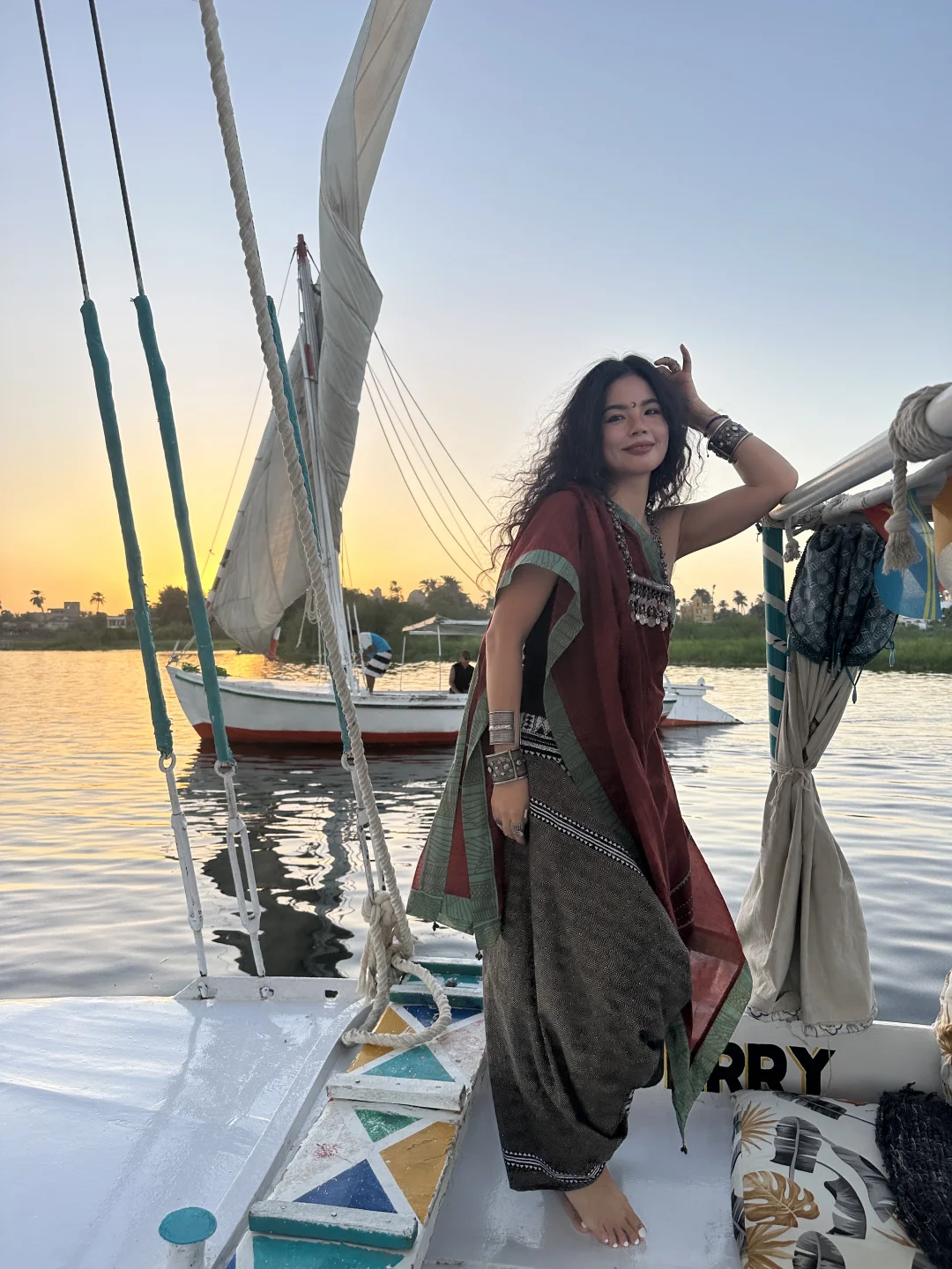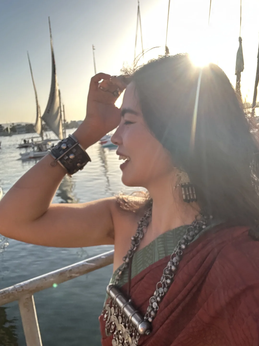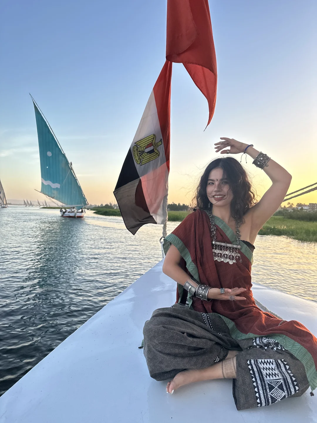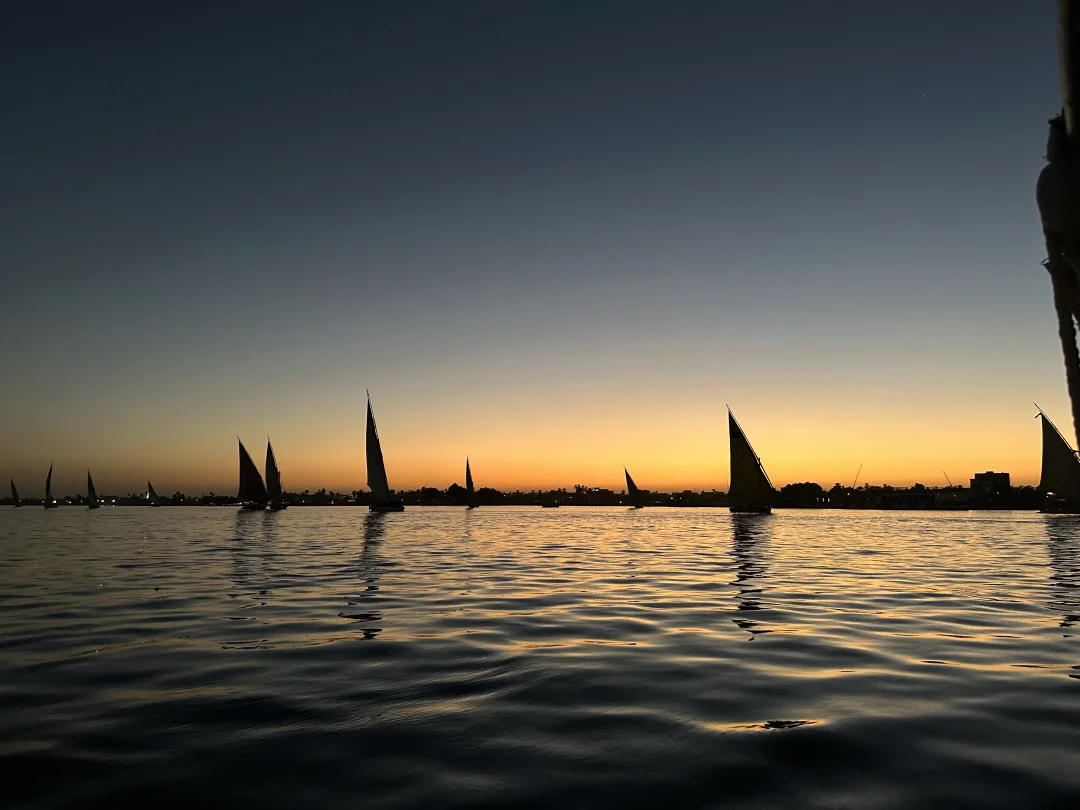 尼罗河的三角帆船⛵️真的是可以天天坐的 6点最佳的看日落时间 500埃镑一个小时记得提前约 有时候手机比相机拍照更有灵魂 记录当下的每个状态 美好的一天是自己给的爱自己啦💗