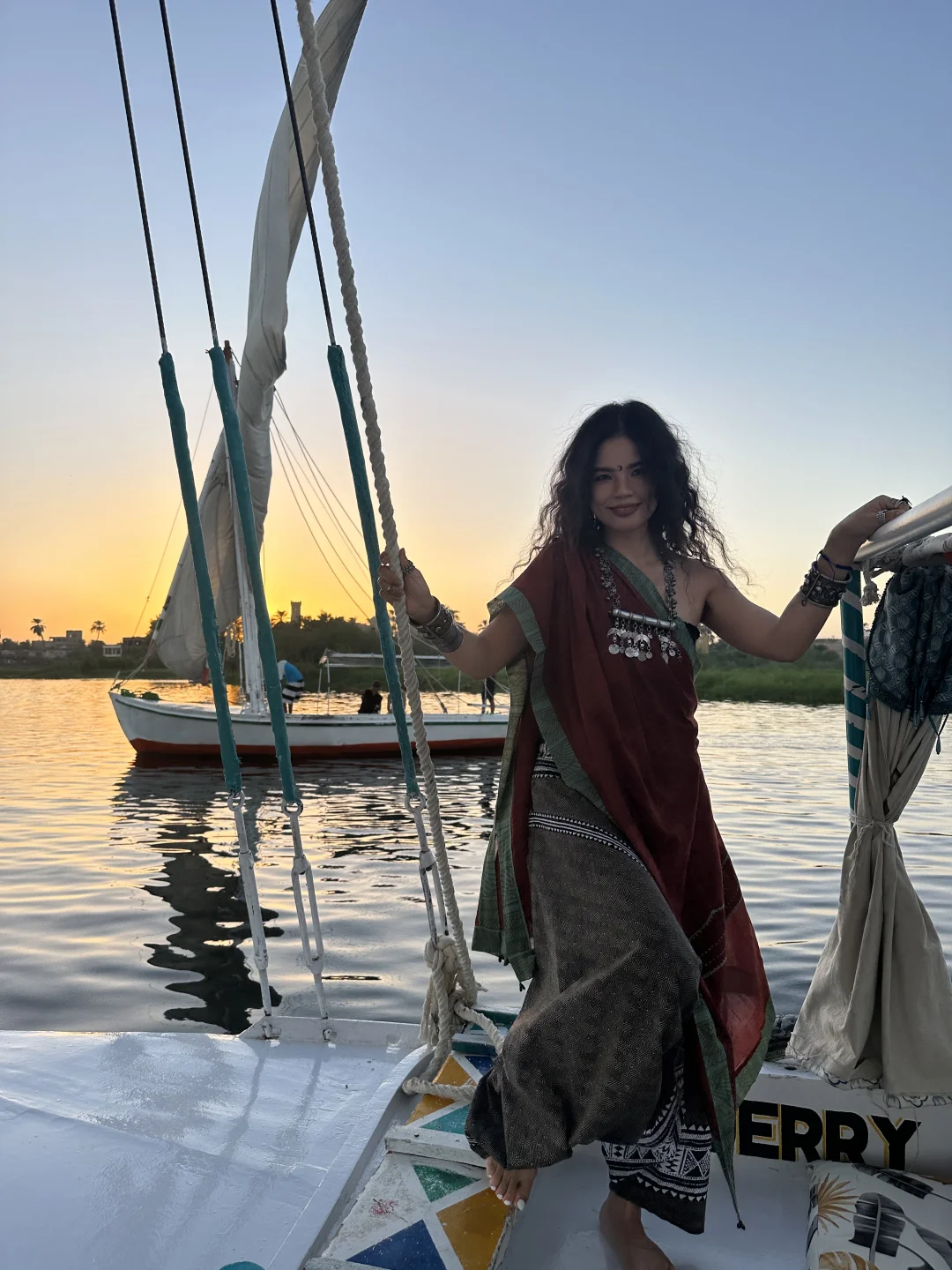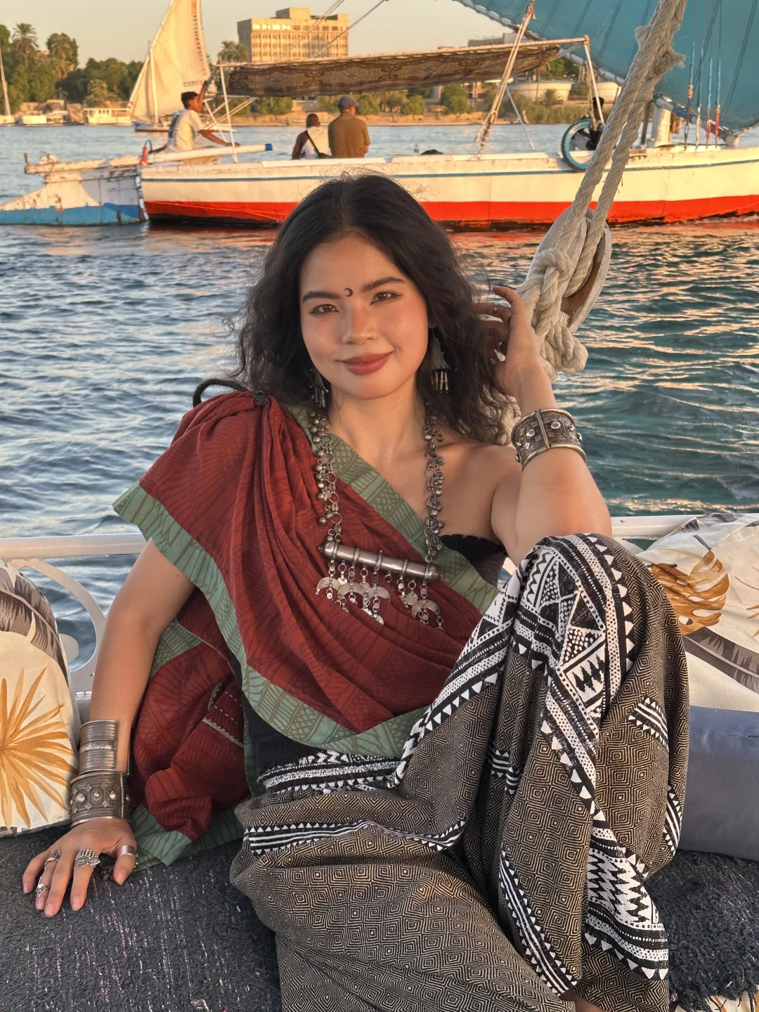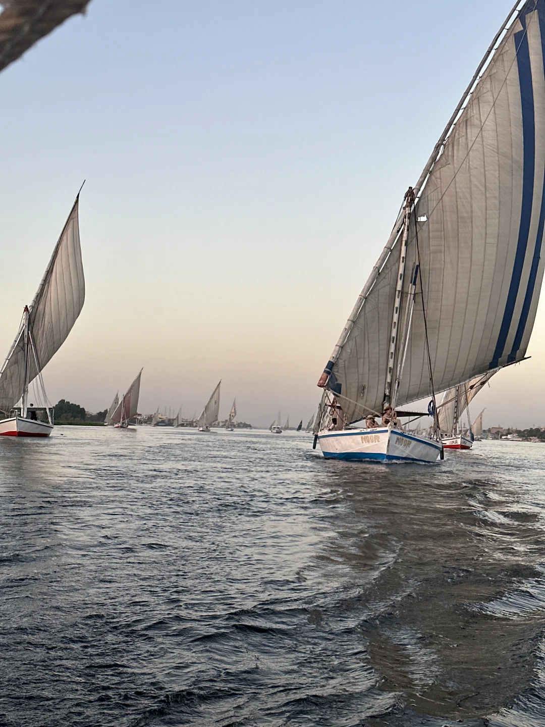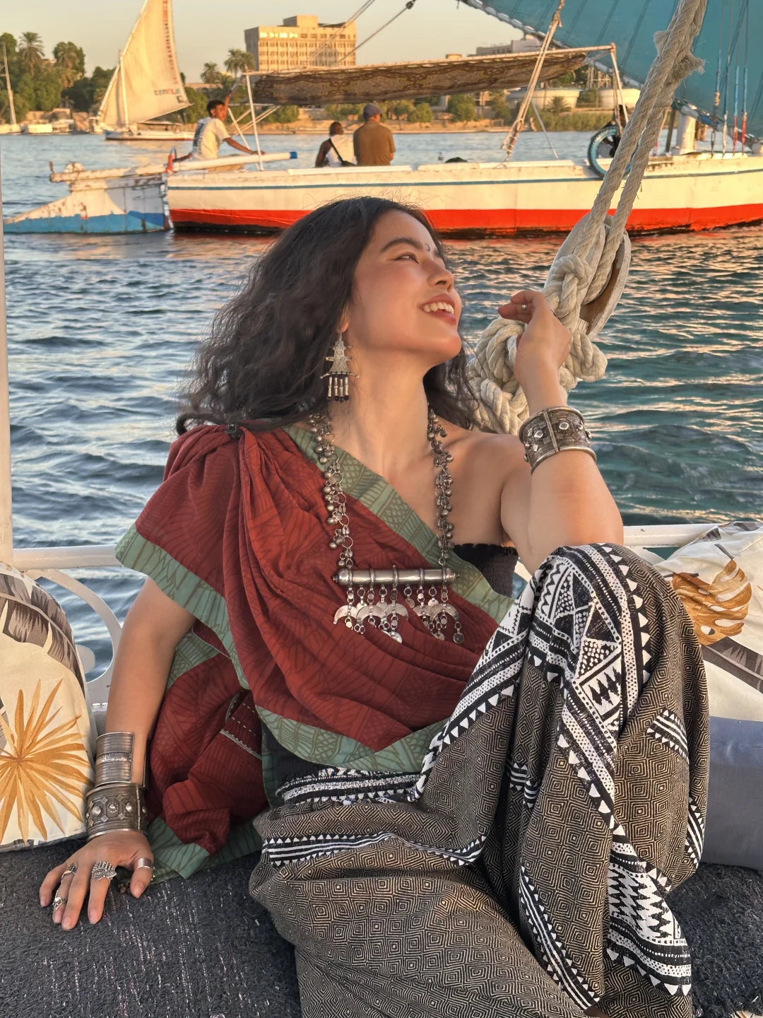 尼罗河的三角帆船⛵️真的是可以天天坐的 6点最佳的看日落时间 500埃镑一个小时记得提前约 有时候手机比相机拍照更有灵魂 记录当下的每个状态 美好的一天是自己给的爱自己啦💗