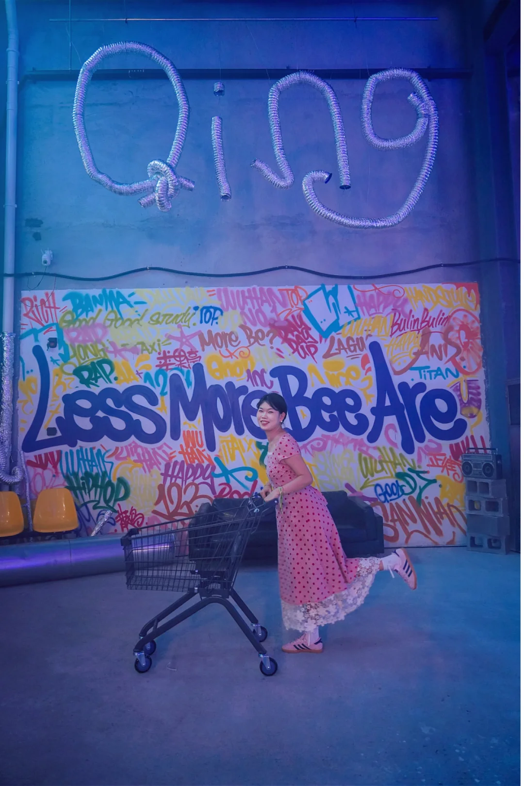 最绝的是往里走的老厂房区域,推门瞬间像闯进另一个世界:墙面满是色彩炸裂的涂鸦,其中一句“Less more bee are”让人愣了两秒,反应过来是武汉话“勒是莫比啊”的谐音,又潮又接地气,本地人看了都要笑出声!😂