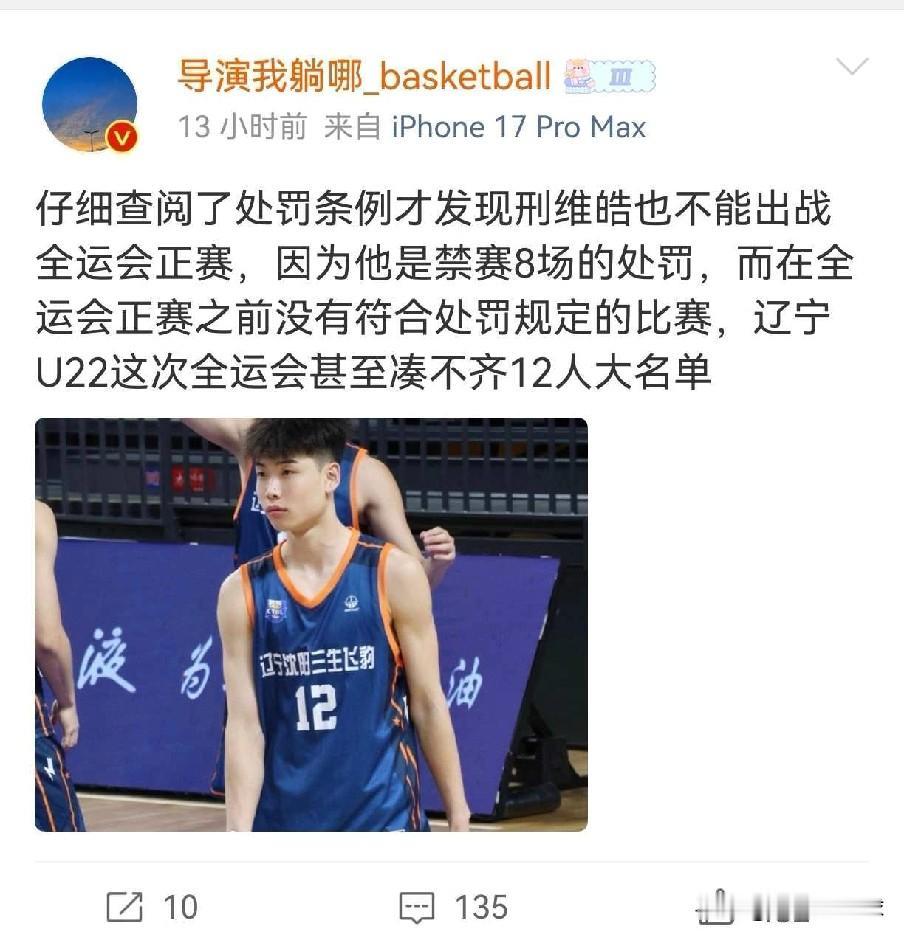 邢维皓等人被禁赛!辽篮U22全运会恐难以凑齐12人 近日据媒体人导演我躺哪透露