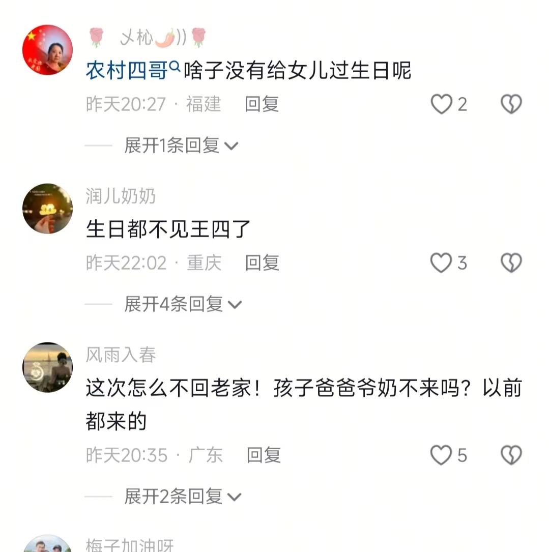 我预料到了农村小英子会给大女儿王子鑫庆祝生日 也预料到了梅梅和王洋夫妇带着娃会参加 万万没想到农村四哥没有来,女儿生日,爸爸却不在场,这对小孩子的心理会产生怎样的影响 本来刷到农村小英子带大女儿王子鑫在火锅店庆生,我还想着“哇,小公主生日肯定巴适惨了”,结果盯着屏幕瞅了半天,越看越不对劲——桌子中间摆着蛋糕,梅梅姐、王洋夫妇都来了,连徐开心都忙着分盘子,唯独少了最该在的人:农村四哥!这事儿搁谁身上不纳闷啊?好好的生日宴,亲爹全程缺席,咋想都觉得怪怪的,你们有没有过这种“热闹里藏着空”的感觉? 梅梅姐是最先到的,手里拎着个方方正正的纸袋,一进门没多废话,直接往王子鑫座位旁的空椅子上放,我还琢磨呢,这里面是不是小公主喜欢的发卡或者玩偶?后来王洋夫妇带着娃也来了,那小孩特可爱,一进门就拽王子鑫的衣角,小公主也乖,抬手就握住小孩的手,轻声细语说话,画面看着挺暖。徐开心更麻溜,从店员那儿接了一次性盘子叉子,挨个儿分,最后剩的还不忘往桌子角一放,妥妥的“气氛组+打杂组”,太给力了!可越看越觉得少点啥,哦对,四哥!全程没露个脸,我晕,这爹当的? 说真的,王子鑫这小姑娘真的绝绝子!小英子蹲那儿插蜡烛的时候,她没坐着不动,直接起身站旁边,双手扶着蛋糕盒边缘,生怕盒子歪了把蛋糕碰坏,多贴心啊!等蜡烛点着,她乖乖站到蛋糕前,双手合十闭着眼睛,大概五秒才睁开,俯身吹灭蜡烛,仪式感拉满。最让我绷不住的是啥?切蛋糕的时候,她拿起刀从自己这边切入,切下一块就端着盘子往小英子面前送,还说“妈妈照顾我们辛苦,这一块给妈妈”!哎呀妈呀,这孩子也太懂事了吧?梅梅姐都暂停拍视频了,一个劲儿点头,王洋夫妇也对视一眼,那眼神里全是夸,徐开心还补了句“说得对”,瞬间觉得这生日宴,孩子比大人还拎得清。 本来我还安慰自己“可能四哥真有急事,比如地里有活走不开”,结果有人当场问小英子“四哥咋没来”,她就低头整理手里的叉子,慢悠悠回了句“他有事走不开”,没下文了!之后满桌人聊天,全围绕王子鑫的作息、学习,没人再提四哥,我都替他们觉得尴尬。等活动结束,大家陆续走了,小英子牵着王子鑫走在最后,后面又有人问“四哥到底去哪了”,她干脆不回头,连句回应都没有,这态度也太让人郁闷了吧?咋就不能说句实在话呢? 我还特意去翻了翻他俩的账号,结果一扒更懵——往前数三个月,小英子发的视频全是下地耕种、在家做饭、带娃购物,没一个镜头有四哥;四哥的账号更绝,要么跟朋友出去干活,要么在田间整理农具,要么跟人在院子里谝闲传,也没小英子的影!关键是,俩人账号连互动都没有,既不互相点赞,也不在评论区留言,跟陌生人似的。有网友在评论区问“为啥许久不同框”,运营团队连个屁都不放,相关评论很快就被其他留言盖过去,这也太刻意了吧? 之前我有个做农村网红的朋友,跟她老公故意玩“不同框”,就为了让网友猜“是不是离婚了”,然后流量涨一波,等大家吵得差不多了,再“和好”拍视频,赚一波热度。当时我就觉得这操作挺膈应人的,现在看四哥和小英子,我又有点犹豫——要是为了流量,拿孩子的生日当筹码,也太扯了吧?但要是真有矛盾,好好解决啊,躲着算咋回事?之前听山上庙里的师傅说“人和人的缘分,藏在吃饭、过节这些小事里,刻意躲着,要么是心里有结没解开,要么是有别的算计”,这话现在想想,还真有点戳中要害。 总之啊,不管是真有矛盾还是想炒流量,都别让孩子受委屈。王子鑫那么懂事,切蛋糕先想着妈妈,她要是知道亲爹缺席可能是“故意的”,得多难过?要是有结,夫妻俩好好坐下来聊聊,没什么解不开的;要是想涨粉,靠正经内容吸粉不好吗?非得搞这些“悬念”,时间长了网友也会看腻的。 你们觉得呢?要是换作你,家里孩子生日,能让另一半故意缺席吗?得闲的时候多跟家人拉呱,说说心里话,比啥都强,别到最后,热闹是别人的,自己心里空落落的,那多不值当啊!